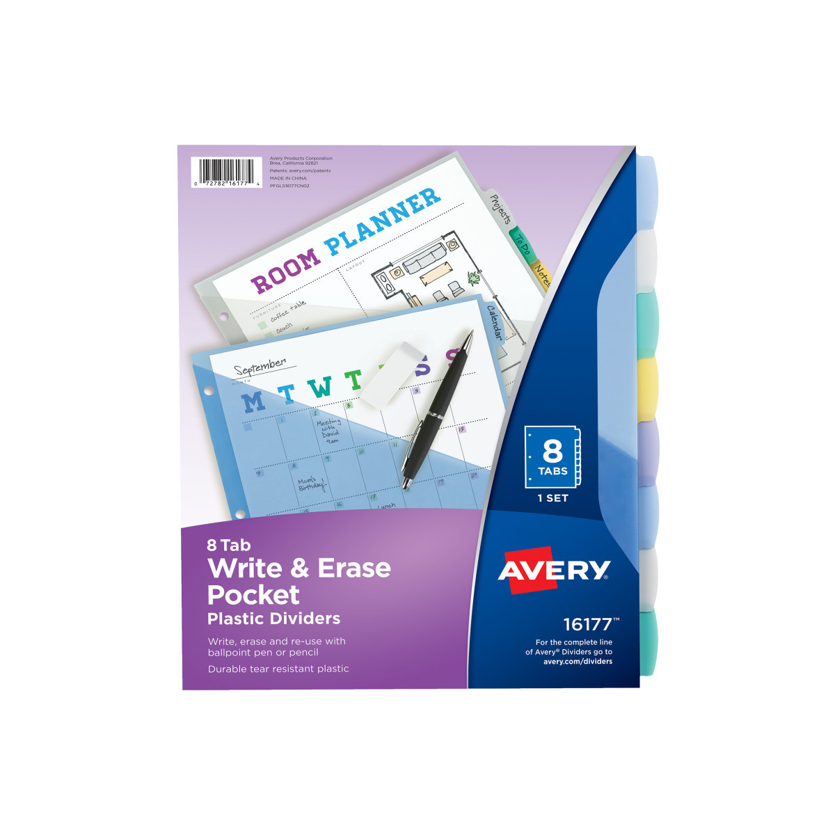 Write, erase and reuse these Avery 8-Tab Write & Erase Pocket Dividers to your heart's content. The wide design works perfectly with sheet protectors so that you can still view your tabs at a glance. Each 3 ring binder divider is made of durable, tear-resistant PVC-free plastic designed to hold up to frequent referencing. Write directly on the multicolor divider tabs with a ballpoint pen or pencil, and erase when you're ready to repurpose your page divider for the next project. The front pocket in each plastic divider is perfect for storing your loose, unpunched or smaller sized sheets, photos and documents. Each divider in this 8-tab set features a fun pastel color that is sure to stand out when you open your binder, and is perfect for color coding and quick identification. Tabbed dividers are 3-hole punched and ready for immediate use in standard 3 ring binders. This set of 8 write-on binder dividers is great for homework organization, personal finance planning, recipe binder dividers, as a coupon organizer, or anything else that needs sorting.