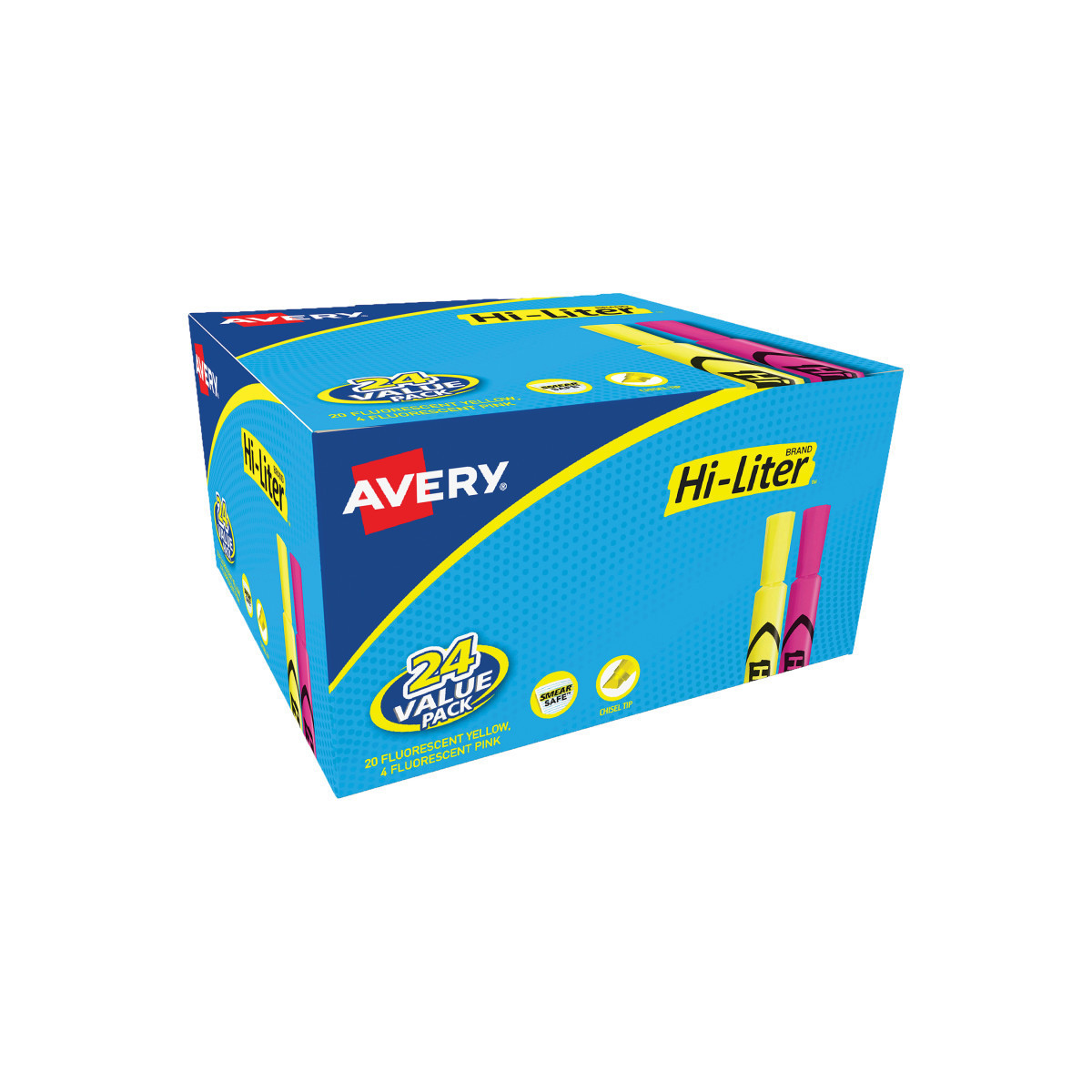 Always be ready to take notes and keep your school supplies stocked with this assorted pack of Avery 98189 Hi-Liter Pink and Yellow Highlighters. Each pack includes 20 fluorescent yellow highlighters and 4 fluorescent pink highlighters. Avery highlighters feature Smear Safe technology to make sure that the ink won't smear across most pens, markers and inkjet inks. The unique ink also won't dry out for up to a week, even when the cap of the highlighter is left off. ACMI AP certified as non-toxic, these highlighters are great for school supplies, offices and homes. The versatile chisel tip is built tough to avoid fraying and can also be tilted at different angles to write in a variety of widths. Whether you're a student making notes in a textbook, a teacher proofreading an essay or a lawyer marking documents, an Avery highlighter will always be a smart choice to keep nearby.