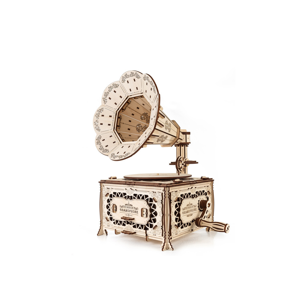 Step back in time with our exquisite replica of an antique wooden gramophone, reminiscent of the early 20th century. This meticulously crafted model features a rotating wooden record that can be activated by a side handle for a touch of nostalgia. With a hidden drawer in the base to place your phone, you can enjoy your favorite music while it is amplified by the stunning speaker cone as the turntable elegantly rotates.