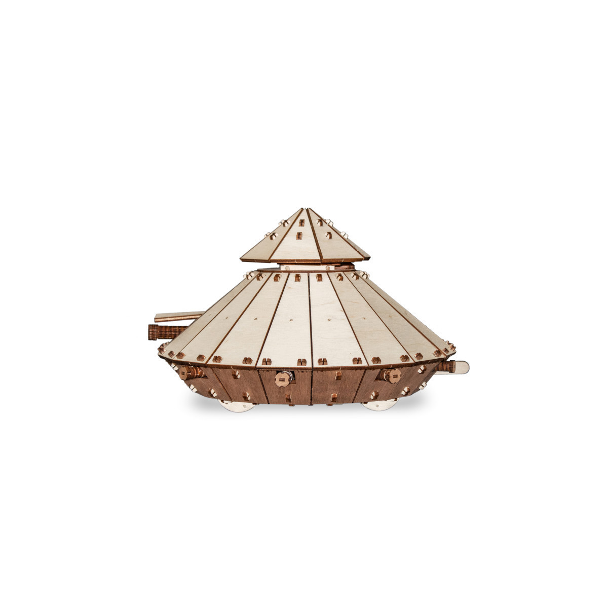 Dive into history with this mechanical wind-up 3D-puzzle of Leonardo Da Vinci's fighting vehicle, a replica of the tank designed in 1487. This intricate model features 360° canons, sloped armor for increased stopping power, a rotating rubber-band mechanism, and wooden gears inspired by the original invention. With a stop & go lever, this historical masterpiece is a must-have for any history enthusiast or puzzle lover.