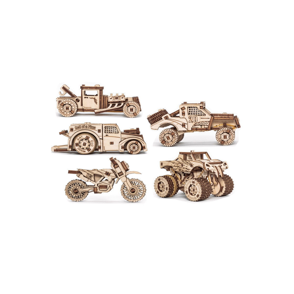 Get ready for hours of fun and creativity with our 5-in-1 set of mechanical wooden puzzles! This set features small and stylish vehicles that you can assemble yourself. With a total of 364 pieces, you'll have the opportunity to build a Hot Rod (61 pieces), Monster Truck (108 pieces), Prerunner (77 pieces), Dragster (92 pieces), and Cross Bike (26 pieces). Each puzzle comes with its own unique design and varying levels of difficulty, ensuring that there's something for everyone. Made from high-quality wood, these puzzles are not only durable but also environmentally friendly. Whether you're a puzzle enthusiast or looking for a fun activity for the whole family, our 5-in-1 set of mechanical wooden puzzles is the perfect choice.