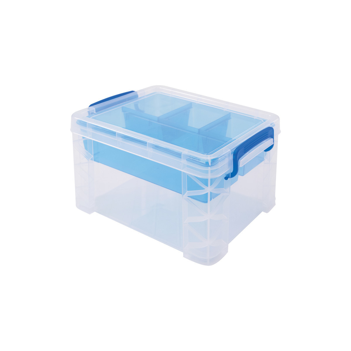 The Super Stacker Divided Storage Box is ideal for storing pens, pencils, small office supplies and more. Lock tight handles keep contents secure, while stackable design helps save space. Features a removable storage tray with multiple compartments to keep your supplies separated and organized. Measures 10.12"W x 7.5"L x 6.5"H.
