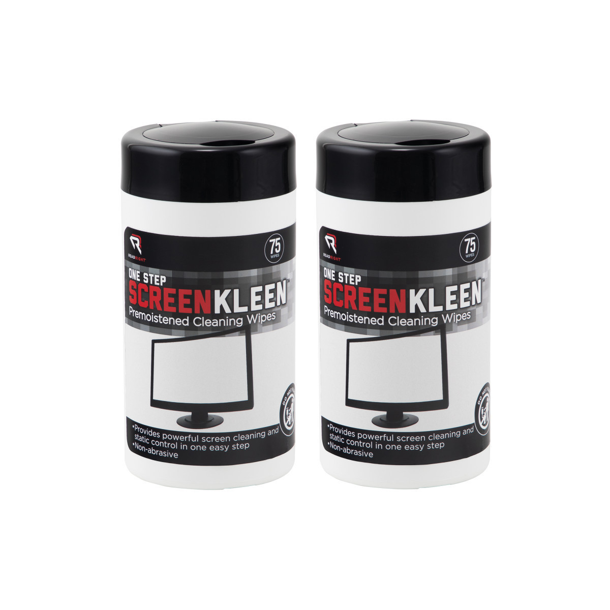 ReadRight ScreenKleen One-Step Cleaning Wet Wipes provides powerful screen cleaning performance and static control, all with the convenience and cost savings of a one-step product. These cleaning pads are nonabrasive, yet strong enough to remove dirt, dust, even stubborn fingerprints. This economical performer is perfect for every workstation. Not for use on nylon mesh/polarized antiglare screens. Each tub includes 75 cleaning wipes. Sold as 2 tubs for a total of 150 wipes.