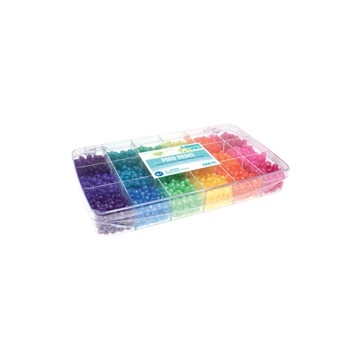 Sulyn Pony Bead Box contains beads in three different finishes and six different colors for more creative fun. Beads work great with Sulyn Thick Elastic Cord (sold separately). All of the beads are stored in a convenient, divided storage box with lid to keep each color and shade separate. Includes 2300 beads.