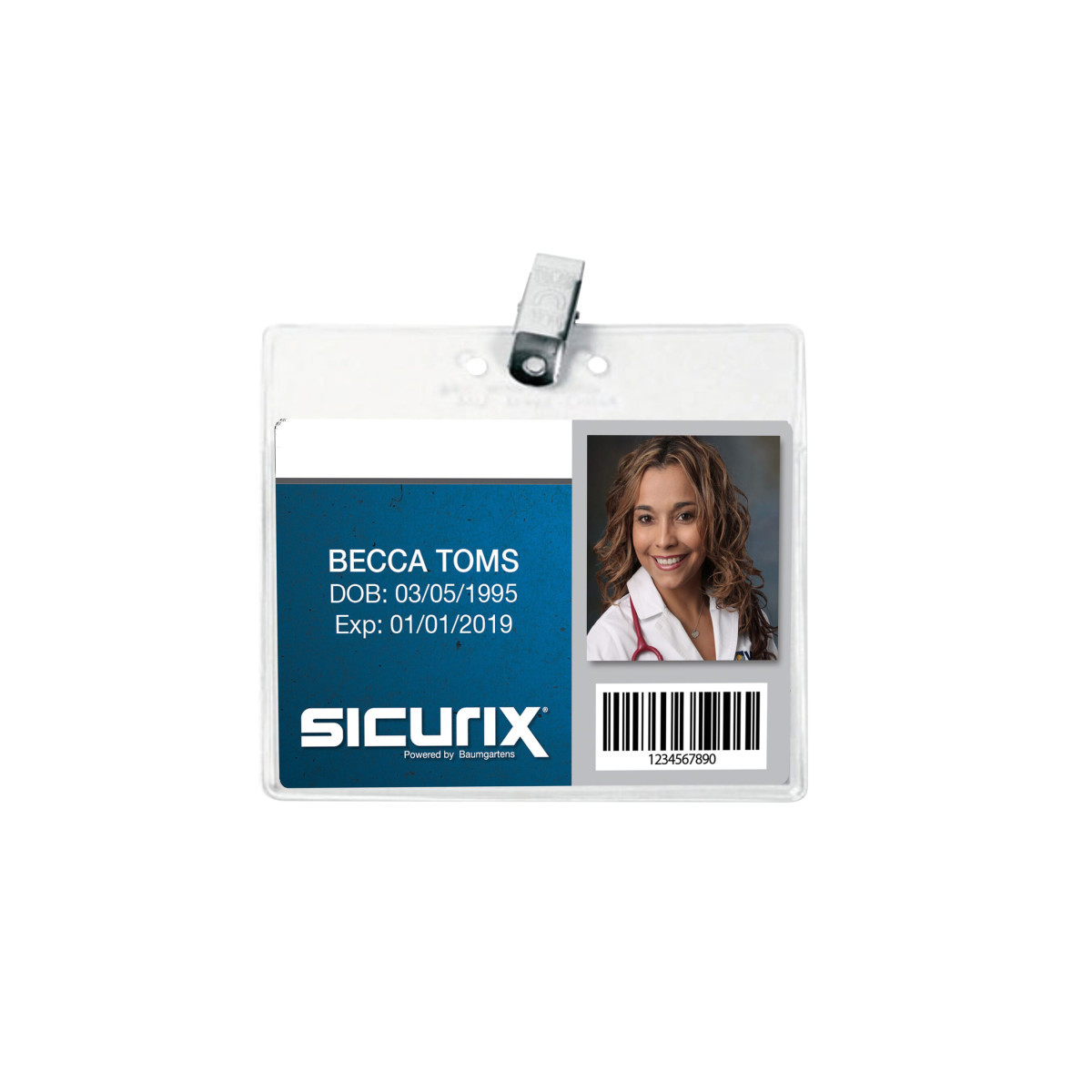 If your job requires that you wear an identity card or security pass SICURIX clear vinyl card holder is for you. Easily attach your ID card or badge to your person for easy identification and security card holder using this transparent, horizontal badge holder. The holder is pre-punched and easily attaches to card reels, lanyards, chains or barbs. The plastic wallet provides protection and easy access for your ID badge. Holders are also great for conference passes, bus passes or student ID cards. These badge holders are for ID cards up to 4" x 3". Pack of 50 horizontal card holders with metal clip.