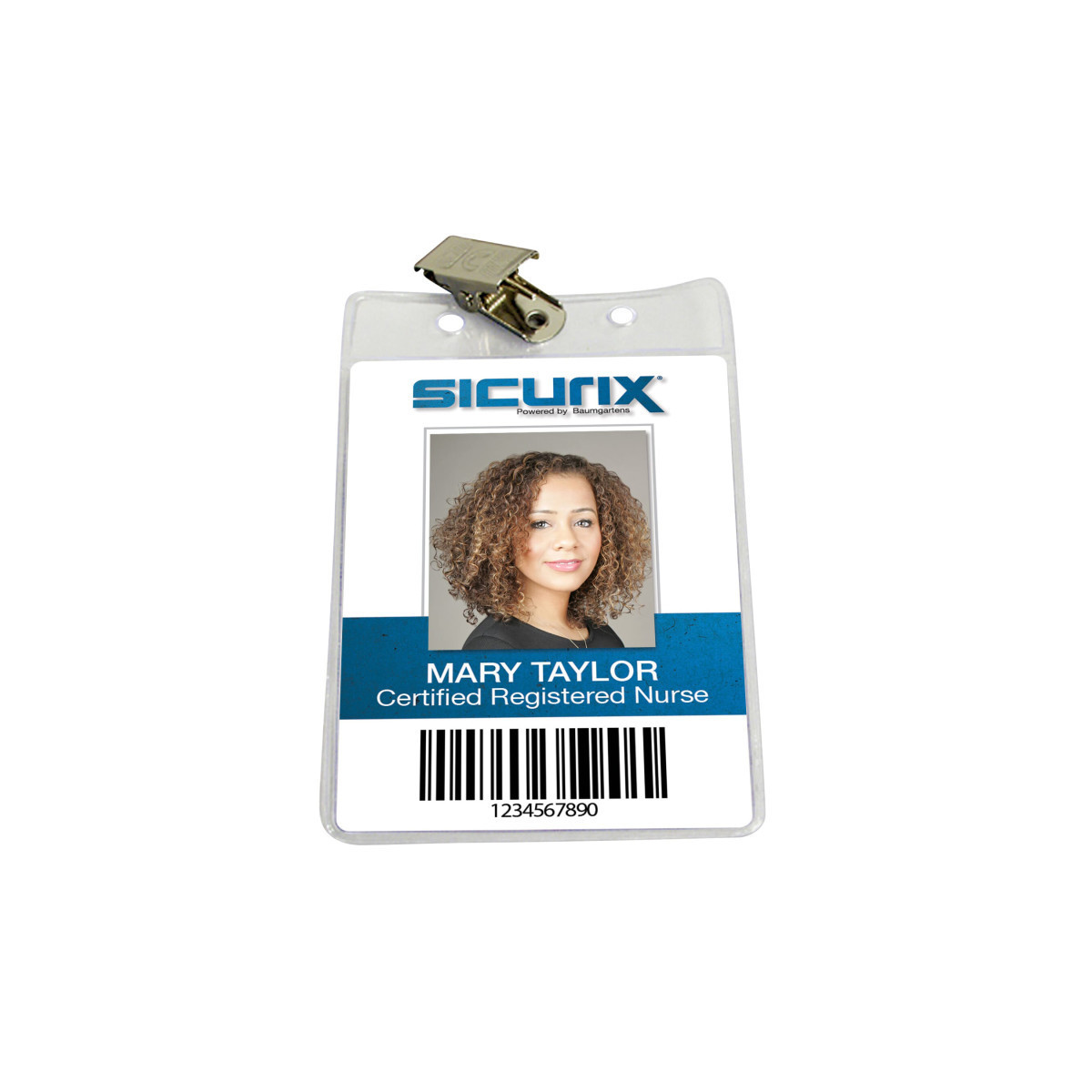 If your job requires that you wear an identity card or security pass SICURIX clear vinyl card holder is for you. Easily attach your ID card or badge to your person for easy identification and security card holder using this transparent, vertical badge holder. The holder is pre-punched and easily attaches to card reels, lanyards, chains or barbs. The plastic wallet provides protection and easy access for your ID badge. Holders are also great for conference passes, bus passes or student ID cards. These badge holders are for ID cards up to 4" x 3". Pack of 50 vertical card holders with metal clip.