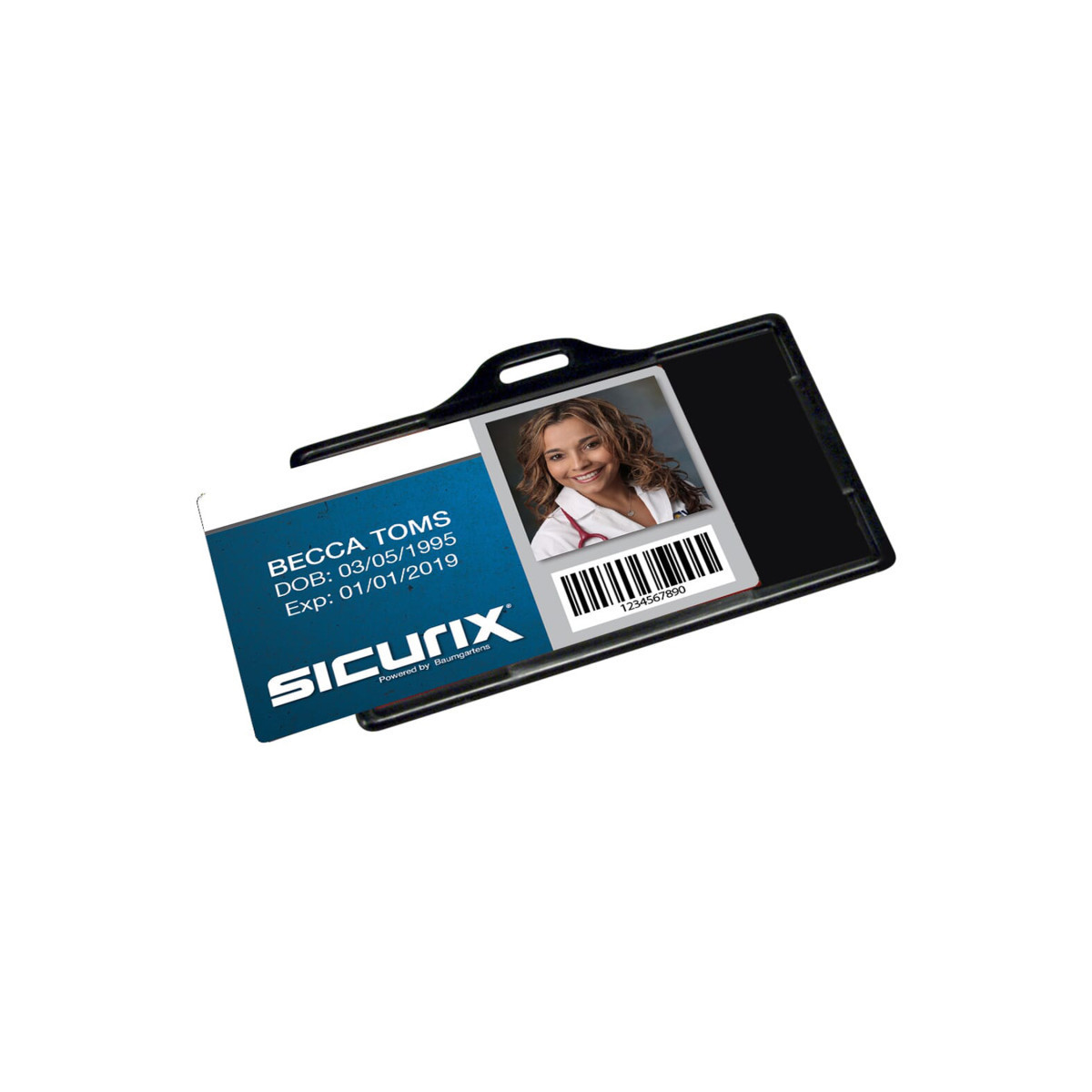 SICURIX Horizontal Black Plastic Card Dispenser holds ID cards up to .30mil thickness, that's around 30 cards. The maximum card insert size is 2-1/8 x 3-3/8 inches. The dispenser provides protection and easy access to your ID, credit cards or business cards. Each card holder has a die cut hole in the back so it attaches easily to card reels, lanyards and chains. They are great for Mifare, mag striped and other ID cards. The notched lip gives you quick and easy access. This pack contains 25 horizontal, black card dispensers.