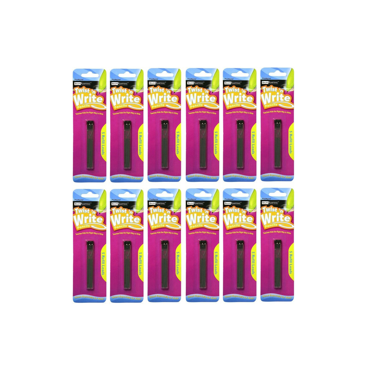 The Twist 'N Write Pencil is specially designed to fit smaller hands and make writing easier. Kids get excited about the Twist 'N Write because it puts the fun back into writing. The pen's wishbone shaped body naturally shapes the fingers into the school-taught "tripod" finger grasp. Whether your kids are doodling or practicing longhand, the soft rubber body and curvy shape are built for comfort and helps them focus on their content without worrying about their pencil grip or their writing speed. The thick 2mm pencil lead never needs sharpening. Just twist the tip to expose more lead. When the lead runs out, simply pop in a fresh one and this pencil will just keep on giving. Each PenAgain Twist 'N Write Pencil refill pack contains 5 spare pencil leads so your kids can keep on writing. Helpful for Arthritis and Ehlers Danlos Syndrome patients. Each pack includes 5 refills. Sold as 12 packs for a total of 60 lead refills.