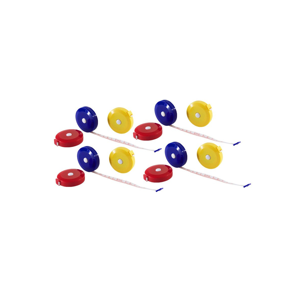 These colorful cloth tape measures are convenient and small enough to put in your shirt pocket or in your desk tray. This cloth tape measure extends up to 60" and retracts with the push of a button. Round plastic enclosure is 2" in diameter in assorted colors. Measures in inches and centimeters. Small enough to go anywhere and everywhere. Lightweight and easy to use. No worries if you're by yourself; it holds secure where you stop it. Sold as a pack of 12 tape measures in assorted colors (no color choice).
