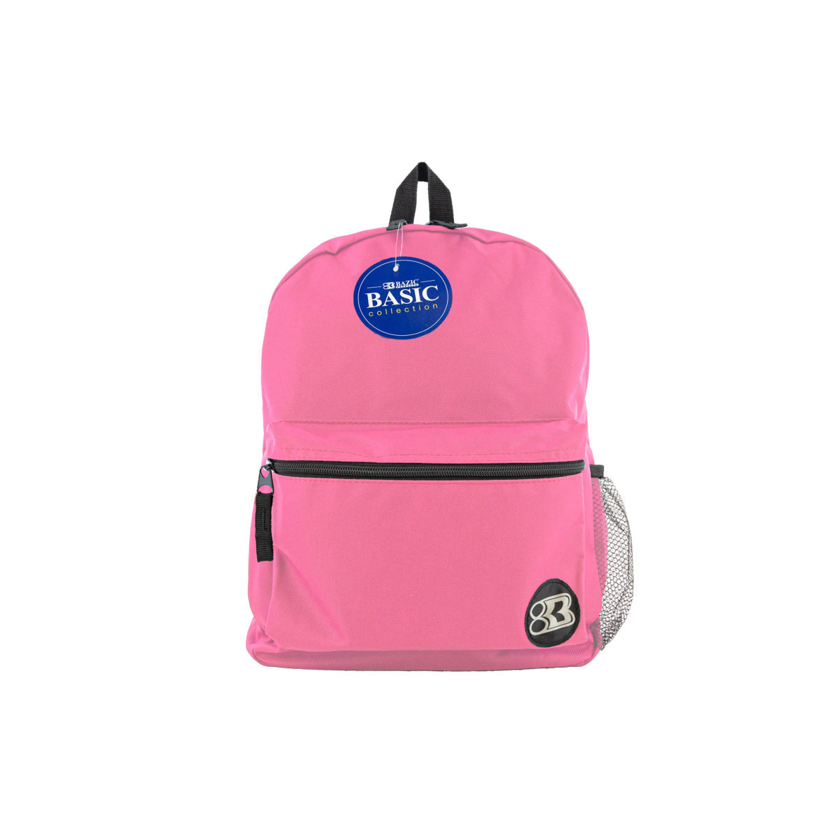 This 16" school bag features 2 compartments: one large compartment mainly for larger items such as text book, binders, and laptops, the other compartment is a smaller compartment located in front, mainly for smaller items, such as cell phones, keys, and hand sanitizer. Both compartments have zipper closure. There are 2 adjustable shoulder straps nicely padded for comfort when carrying the backpack. There are 2 zipper pulls for the large compartment, and 1 zipper pull for the smaller compartment. There is a nylon handle on top of the backpack, convenient for hanging the backpack on hook outside of classrooms, or any hanger. Bazic Products' logo is stitched in the front, on the bottom right of the small compartment for recognition.