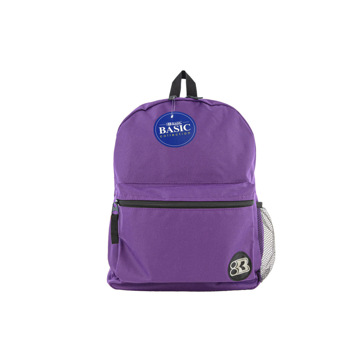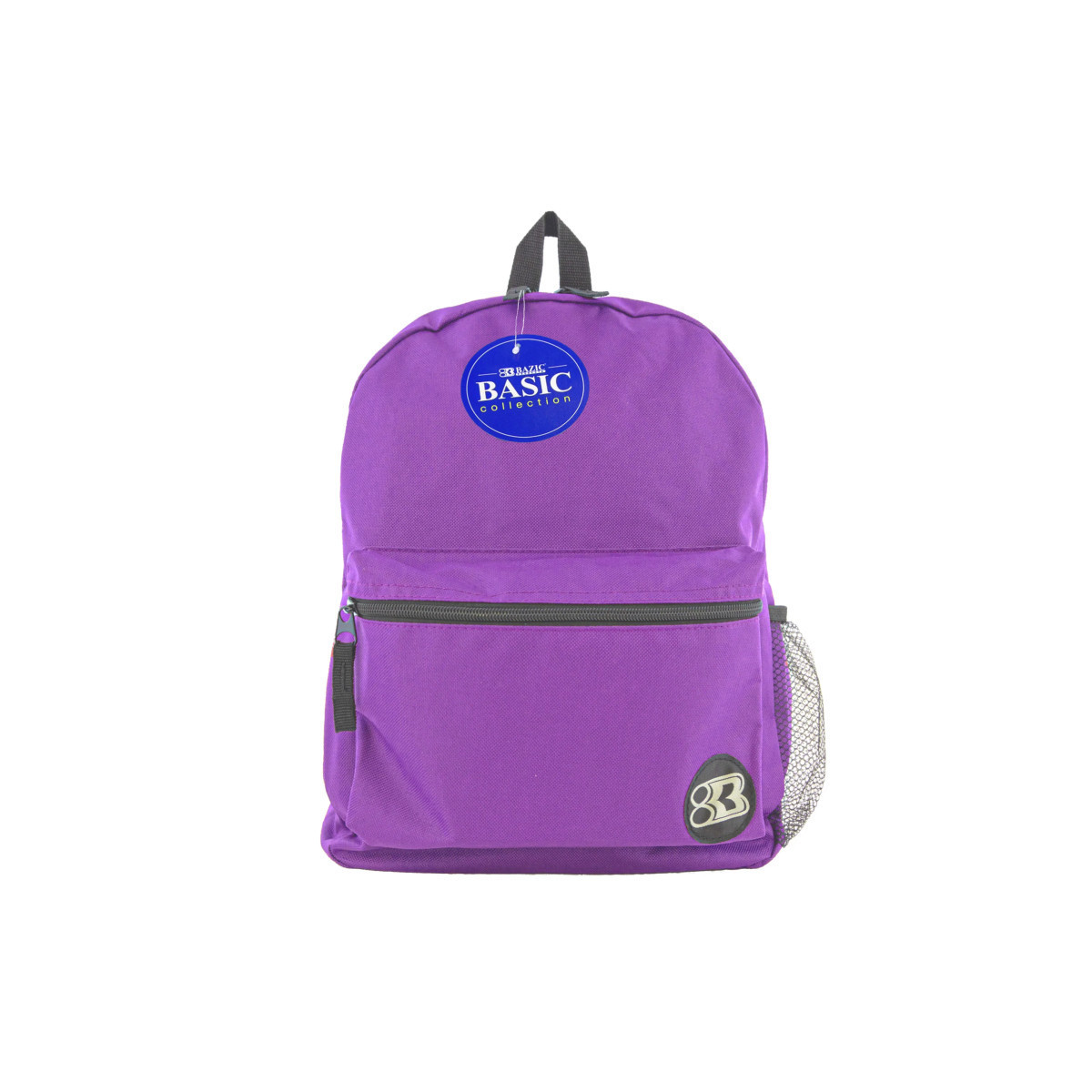 This 16" school bag features 2 compartments: one large compartment mainly for larger items such as text book, binders, and laptops, the other compartment is a smaller compartment located in front, mainly for smaller items, such as cell phones, keys, and hand sanitizer. Both compartments have zipper closure. There are 2 adjustable shoulder straps nicely padded for comfort when carrying the backpack. There are 2 zipper pulls for the large compartment, and 1 zipper pull for the smaller compartment. There is a nylon handle on top of the backpack, convenient for hanging the backpack on hook outside of classrooms, or any hanger. Bazic Products' logo is stitched in the front, on the bottom right of the small compartment for recognition.