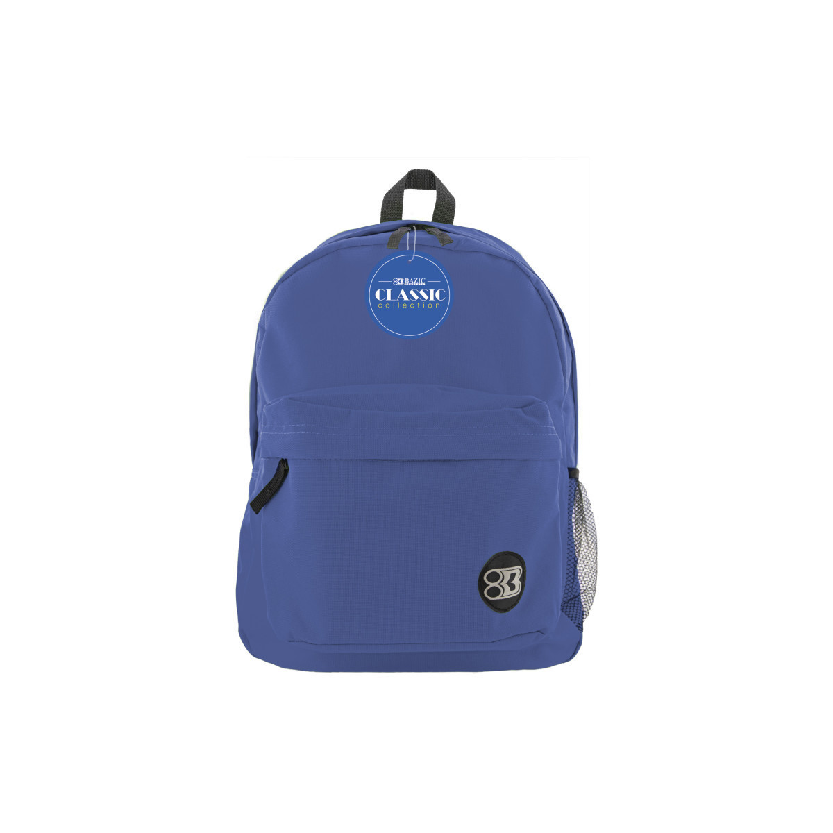This 17" school bag features 2 compartments and a bottle pocket: one large compartment mainly for larger items such as text book, binders, and laptops, the other compartment is a smaller compartment located in front, mainly for smaller items, such as cell phones, keys, and hand sanitizer. Both compartments have zipper closure. The bottle holder is on one side of the backpack. There are 2 adjustable shoulder straps nicely padded for comfort when carrying the backpack. There are 2 zipper pulls for the large compartment, and 1 zipper pull for the smaller compartment. There is a nylon handle on top of the backpack, convenient for hanging the backpack on hook outside of classrooms, or any hanger. Bazic Products' logo is stitched in the front, on the bottom right of the small compartment for recognition.