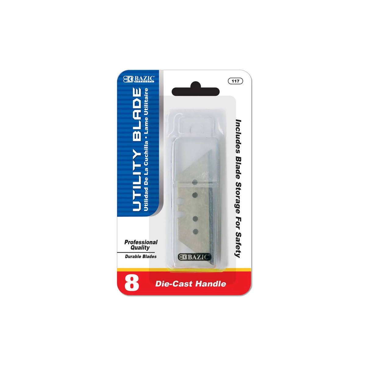 Made of stainless steel. Each blade measures 2.4 x 0.6 inches, with a thickness of 0.4 mm. Ideal for cutting thick, dense sheet materials. Resistant to corrosion and rust. Each pack includes 8 blades and 1 plastic storage case. The sharp edge is perfect for your scraper, trimmer, cutting, and crafting needs. Suitable for use in the office, warehouse, shipping, and home improvement. Excellent for cutting moving boxes, cartons, leather, cardboard, carpet, rubber, fabric, wallpapers, paper, tape, plastic, foam board, DIY school projects, art and craft projects, and more. Lightweight with a die-cast handle. Easy to load the next razor, ensuring you always work with the sharpest edge. Compatible with Bazic Products metal cutter.