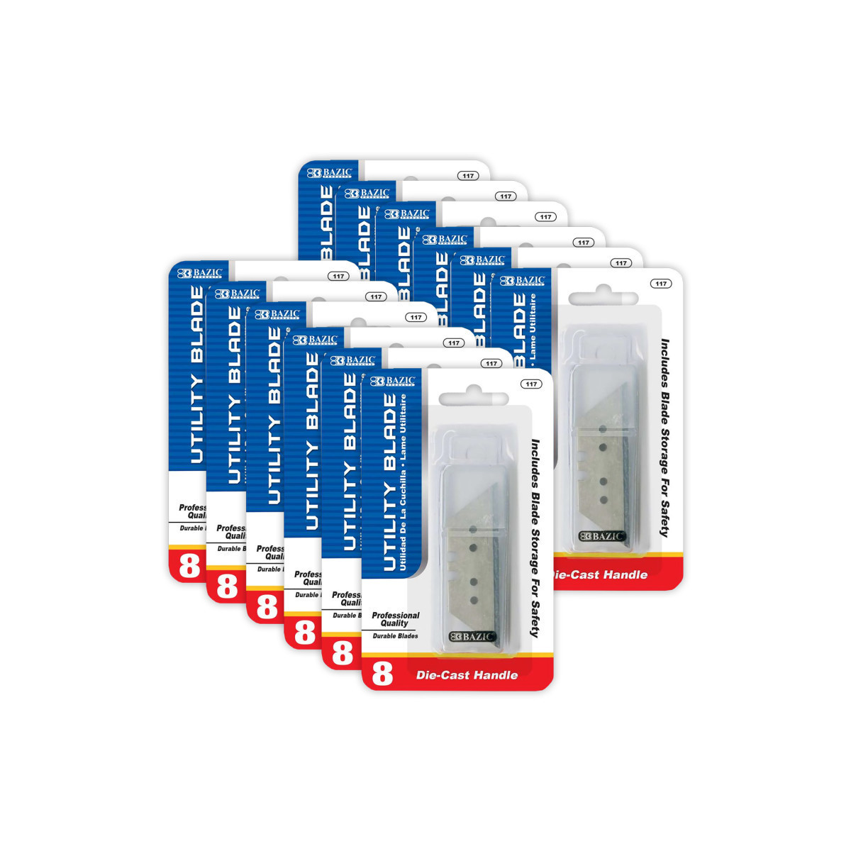Made of stainless steel. Each blade measures 2.4 x 0.6 inches, with a thickness of 0.4 mm. Ideal for cutting thick, dense sheet materials. Resistant to corrosion and rust. Each pack includes 8 blades and 1 plastic storage case. The sharp edge is perfect for your scraper, trimmer, cutting, and crafting needs. Suitable for use in the office, warehouse, shipping, and home improvement. Excellent for cutting moving boxes, cartons, leather, cardboard, carpet, rubber, fabric, wallpapers, paper, tape, plastic, foam board, DIY school projects, art and craft projects, and more. Lightweight with a die-cast handle. Easy to load the next razor, ensuring you always work with the sharpest edge. Compatible with Bazic Products metal cutter. Each pack includes 8 blades and 1 plastic storage case. Sold as 12 packs for a total of 96 blades.