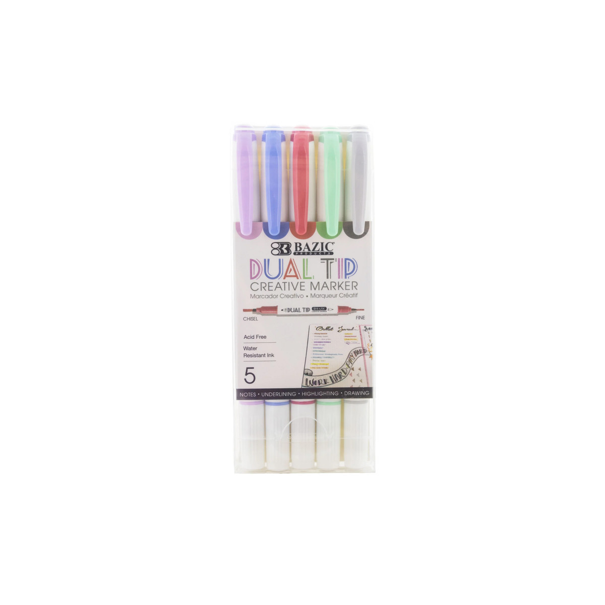 Perfect for both beginners and experienced artists, these markers allow you to unleash your creativity. Whether it's decorating your journal or underlining your notes, these markers are your trusted companions for artistic exploration. Each marker features a chisel tip for broad strokes and a fine tip for intricate details, offering artists and creators versatility and control for any creation. Crafted with acid-free ink that ensures your artwork remains vibrant and fade-resistant over time. Keep your projects pristine even if they come into contact with moisture. Crafted with a non-bleeding formula so you can create sharp, clean lines without worrying about unwanted smudging or feathering. Perfect for layering colors to create more stunning results. Available in a diverse color palette to for you to explore your artistic potential and add vibrancy to your projects with the perfect shades. Each pack includes 5 markers in 5 colors: Concrete Gray, Mint Green, Carnation, Cerulean, Lavender.
