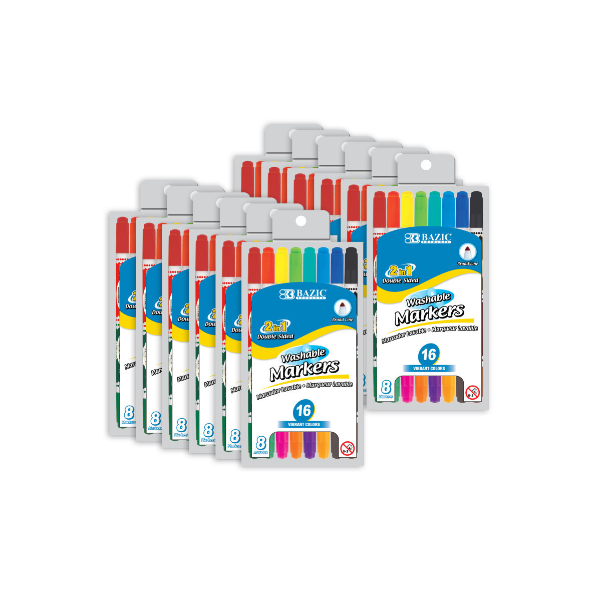 This set of conical tip washable markers is perfect for coloring and drawing. Each marker has two tips, one on each end with different colors. Conical fiber tips (like a cone shape) allow the artist to draw fine line when using the tip in vertical angle, and broad line when using the tip in tilted angles. Wash & Care tips: most clothing can be washed in warm or hot water. Do not use pre-wash or chlorine bleach, repeat laundering if necessary. Each pack includes 8 markers (16 colors). Sold as 12 packs for a total of 96 markers.