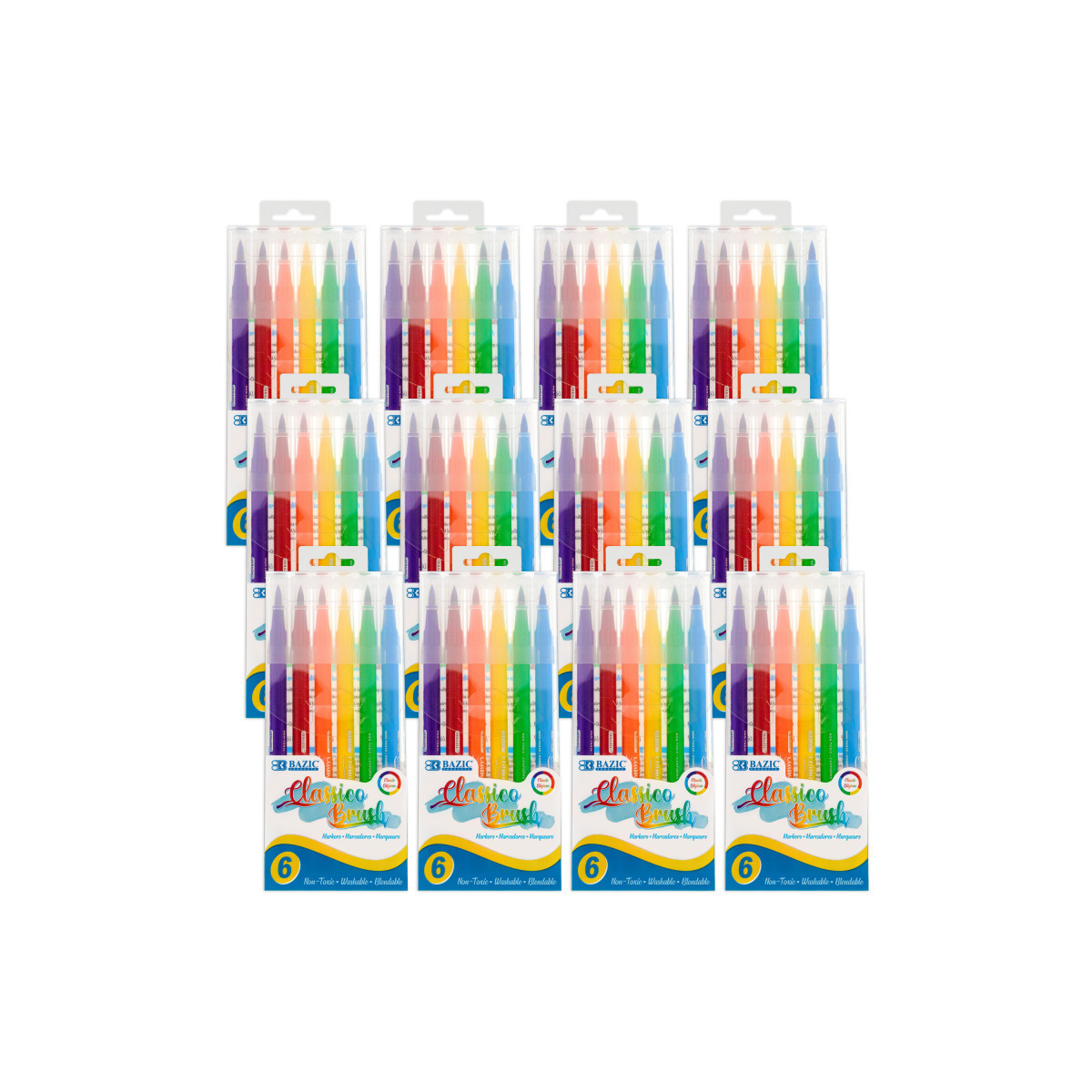 These soft brush markers have 4.5mm brush tip for sweeping, details, calligraphic, broad strokes, or quickly color in large areas. Can be dispersed and mixed with water. Excellent smudge-proof. Smooth flow brush pens accommodate all graphic styles. Perfect for coloring books, card making, and hand-lettering. Each pack includes 6 markers. Sold as 12 packs for a total of 72 markers.
