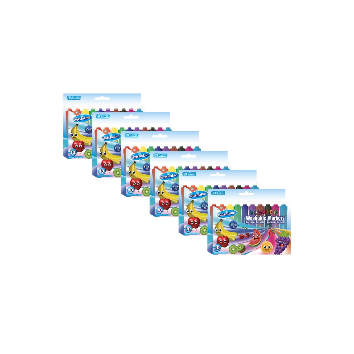 This set of scented washable markers is perfect for coloring and drawing. It comes in 10 different colors: red, pink, orange, yellow, green, light blue, blue, purple, brown, and black. Each color is infused with different scent. They all have chisel tips, which allows the artist to draw fine line when using the pointed tip, and broad line when using the chisel tip. Wash & Care tips: most clothing can be washed in warm or hot water. Do not use pre-wash or chlorine bleach, repeat laundering if necessary. Each pack includes 10 markers. Sold as 6 packs for a total of 60 markers.