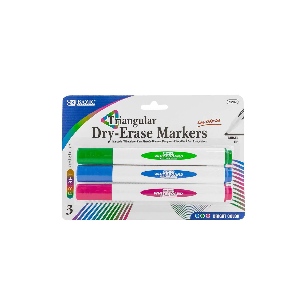 These are assorted bright color dry erase markers, with triangle shape barrels to prevent rolling off the table easily. comfortable for gripping due to the triangle shape. Germany ink for great quality solid color with low odor. These chisel tip markers are able to create thick and thin lines for detailed works of art. Allows you to customize your written message to fit your needs. Ergonomic design to prevent marker from rolling off desk. Low odor ink is safe for indoor environments. Ink pigment is made with easy-wipe formula that'll leave your whiteboard looking as good as new. Smear-proof and quick-drying makes it safe for all uses. Each pack includes 3 dry-erase markers in bright colors.