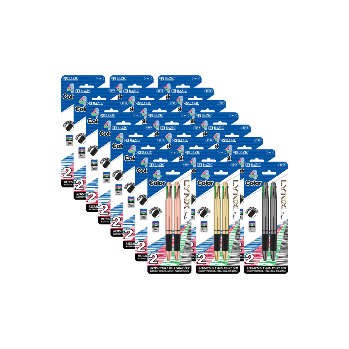 LYNX SATIN TOP 4-COLOR PEN. Each pack includes 2 Retractable 4-Color Ballpoint Pens; Ink Color: Black, Blue, Red and Green. Barrel colors come in assorted colors