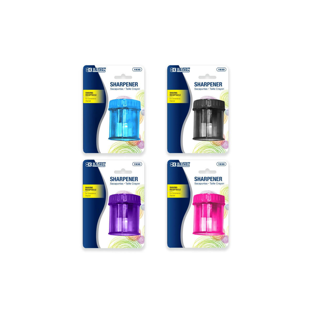 The compact size of the sharpener makes it easy to carry in pencil cases and bags, or store away for organizing. Small size also make it easy to hold. It's a versatile tool for students, artists, and professionals. The single-blade sharpener is designed to efficiently sharpen pencils precisely for optimal writing or drawing performance. Accommodates regular-sized pencils. Measure 1.5" x 1.5" x 1.75". Featuring a round receptacle, this sharpener captures shavings neatly, reducing mess and making cleanup and disposal easy. The semi-transparent design allows you to see when it's time to empty. Includes 1 sharpener in assorted colors (no color choice): Black, Purple, Pink, Blue.