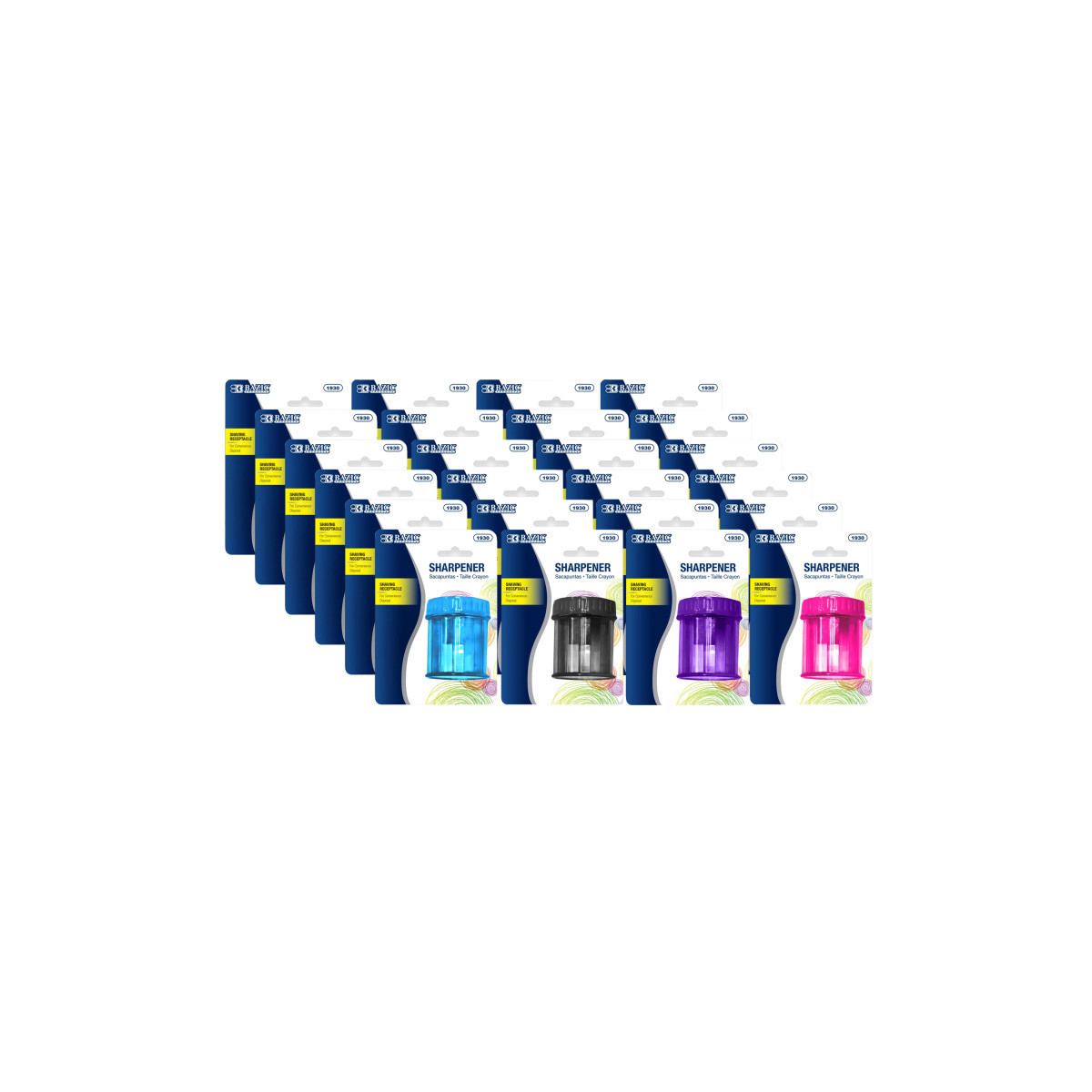 MULTI-PACK. Sold as a pack of 24 sharpeners in assorted colors (no color choice): Black, Purple, Pink, Blue.