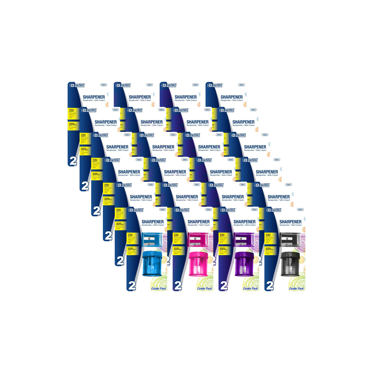 VERSATILE COMBO. Sold as 24 packs, each combo pack includes both a single and a dual blade sharpener, offering the versatility to sharpen a range of pencils, from standard to thicker ones like colored pencils and jumbo graphite.
