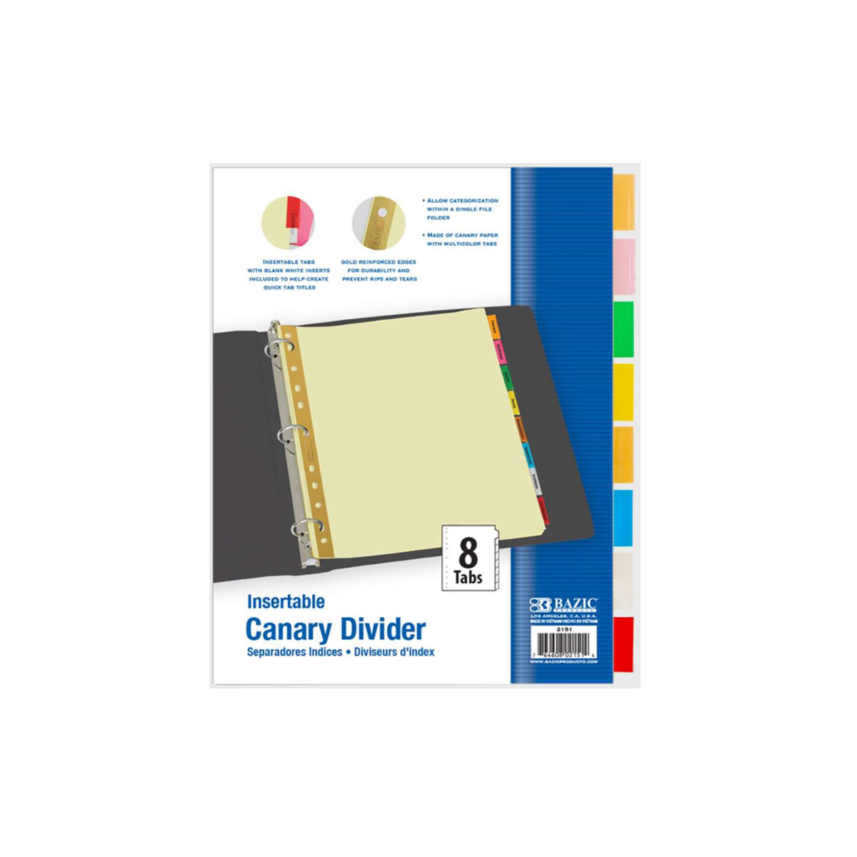 Organize and protect your documents with high quality paper dividers. These canary yellow dividers are customizable with insertable tabs in assorted colors. The dividers load easily into any size 3-ring binders with the 11 available holes. The edges are reinforced for durability and to prevent rips and tears. Great for use at school, home, and office, and offers a professional appearance when used in presentations, portfolios, and reference materials. Includes 8 dividers measuring 11" x 9" each.