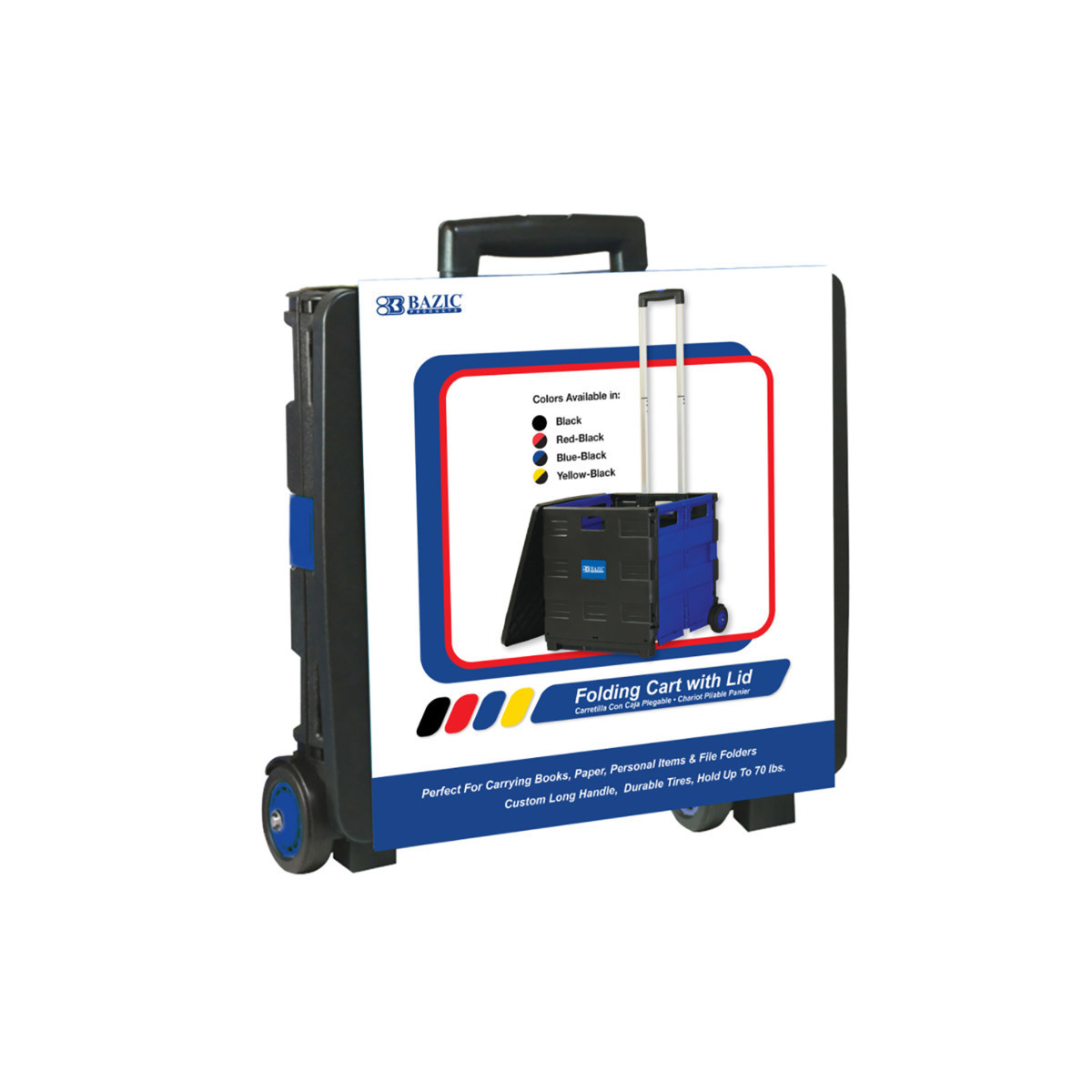 This 2-wheel plastic cart is foldable, so you can assemble it when you need to use it, and fold it down for storage. It has long handle that has few adjustable heights to match your height for comfort use. It is sturdy and can hold up to 70 lbs. Comes with a lid so you can protect your belongings from rain or wind; you can even pile more items on top of the lid to save a trip. Ideal for transporting books, documents, arts & crafts items and more! A great tool for teachers. Black and Blue for a sporty feel and greater look.