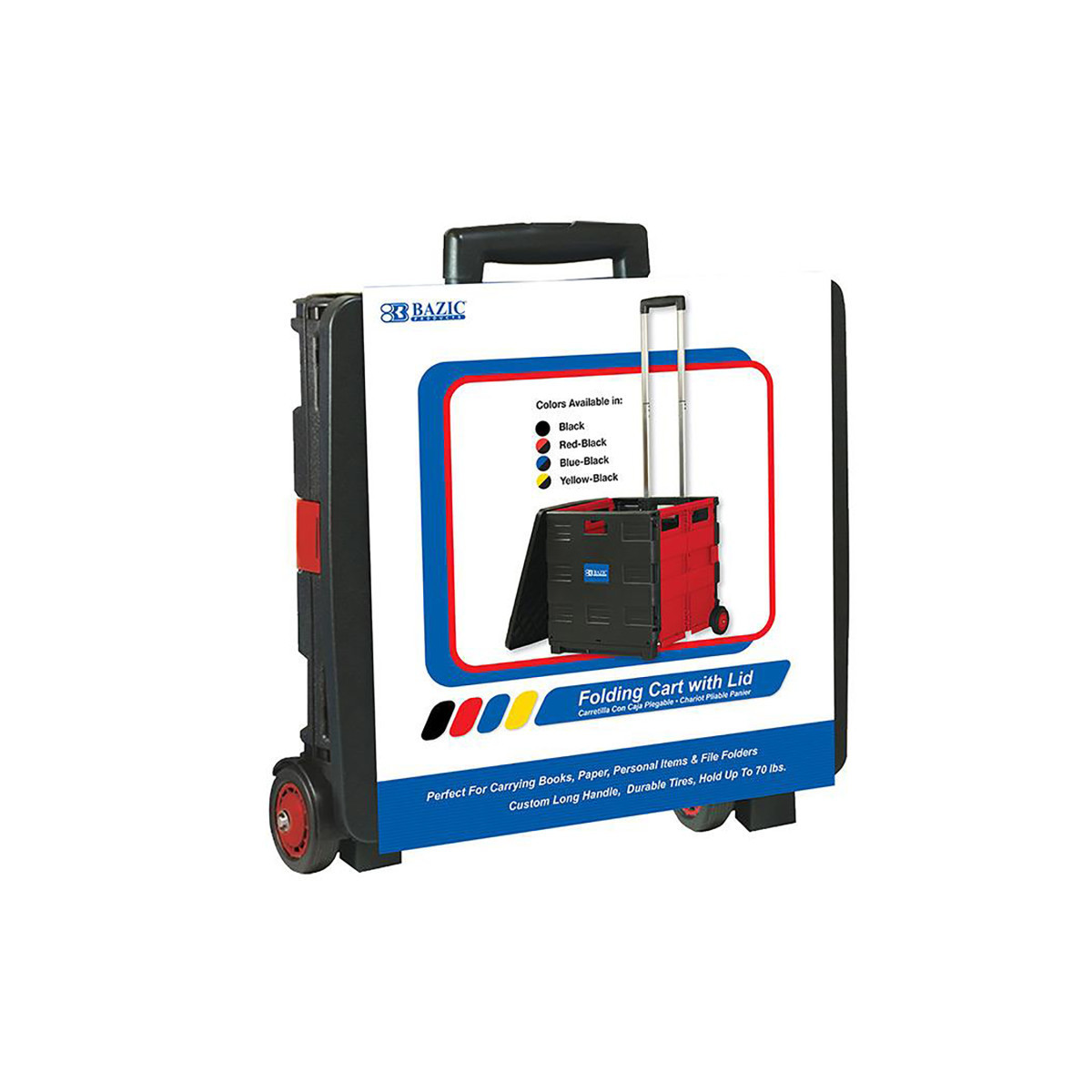 This 2-wheel plastic cart is foldable, so you can assemble it when you need to use it, and fold it down for storage. It has long handle that has few adjustable heights to match your height for comfort use. It is sturdy and can hold up to 70 lbs. Comes with a lid so you can protect your belongings from rain or wind; you can even pile more items on top of the lid to save a trip. Ideal for transporting books, documents, arts & crafts items and more! A great tool for teachers. Black and Red for a sporty feel and greater look.