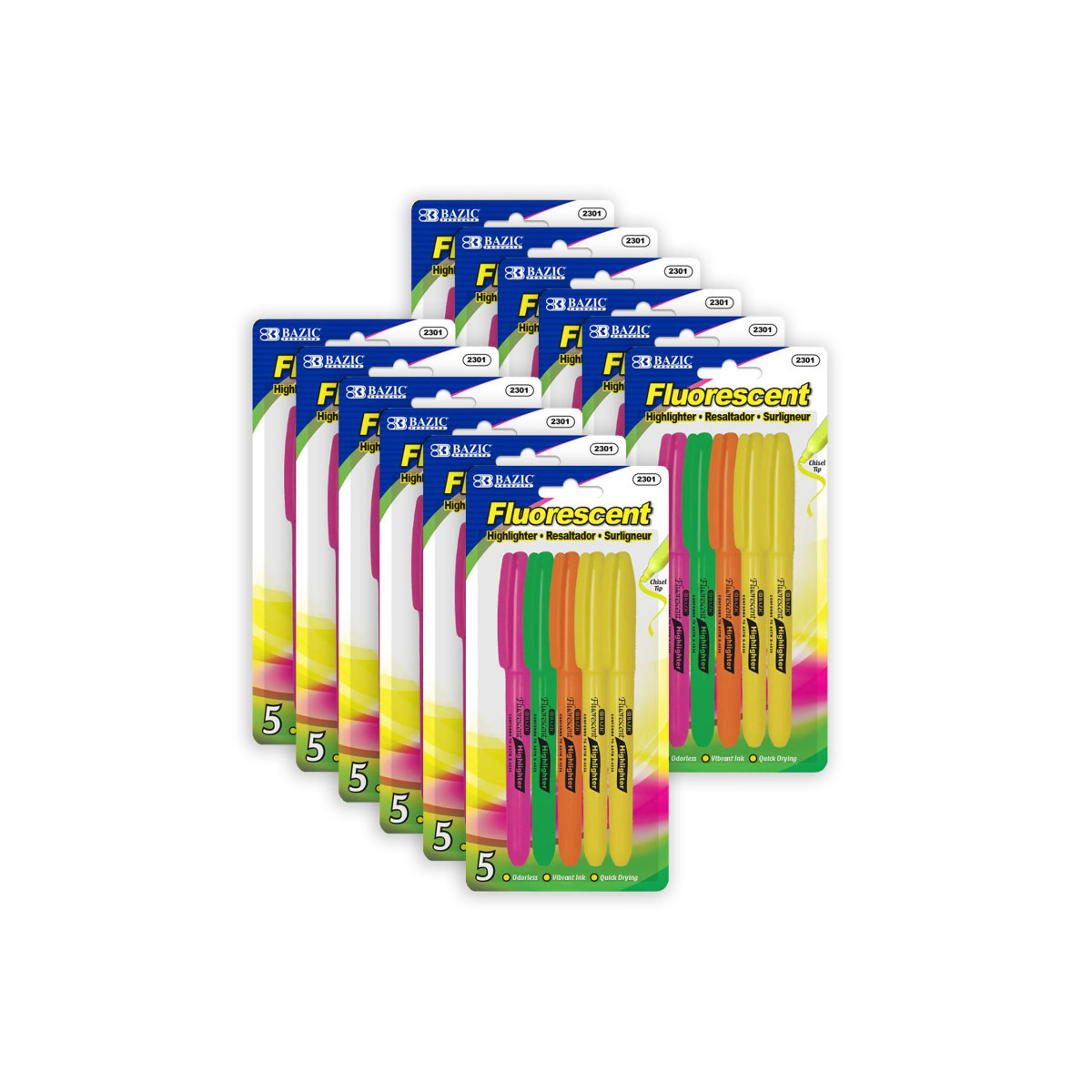 The pen-style highlighter features a narrow barrel and thin chisel tip for precise coverage of smaller text. The non-roll cap with pocket clip adds style and convenience. The highlighter has a molded narrow chisel tip that allows for two line widths: broad for highlighting and fine for underlining details with just a twist of the wrist. The vivid fluorescent ink provides maximum impact and instantly draws attention to key details and important information. The barrel color indicates the ink color. It dries quickly and doesn't bleed through most papers, including glossy and thin papers, smear and smudge-free. The durable tip lasts even after highlighting on rough surfaces. Ideal for college students, teachers, note-taking, working, studying, highlighting key points, underlining text, artistic sketching, coloring books, doodling, and more. Each pack includes 5 highlighters. Sold as 12 packs for a total of 60 highlighters.