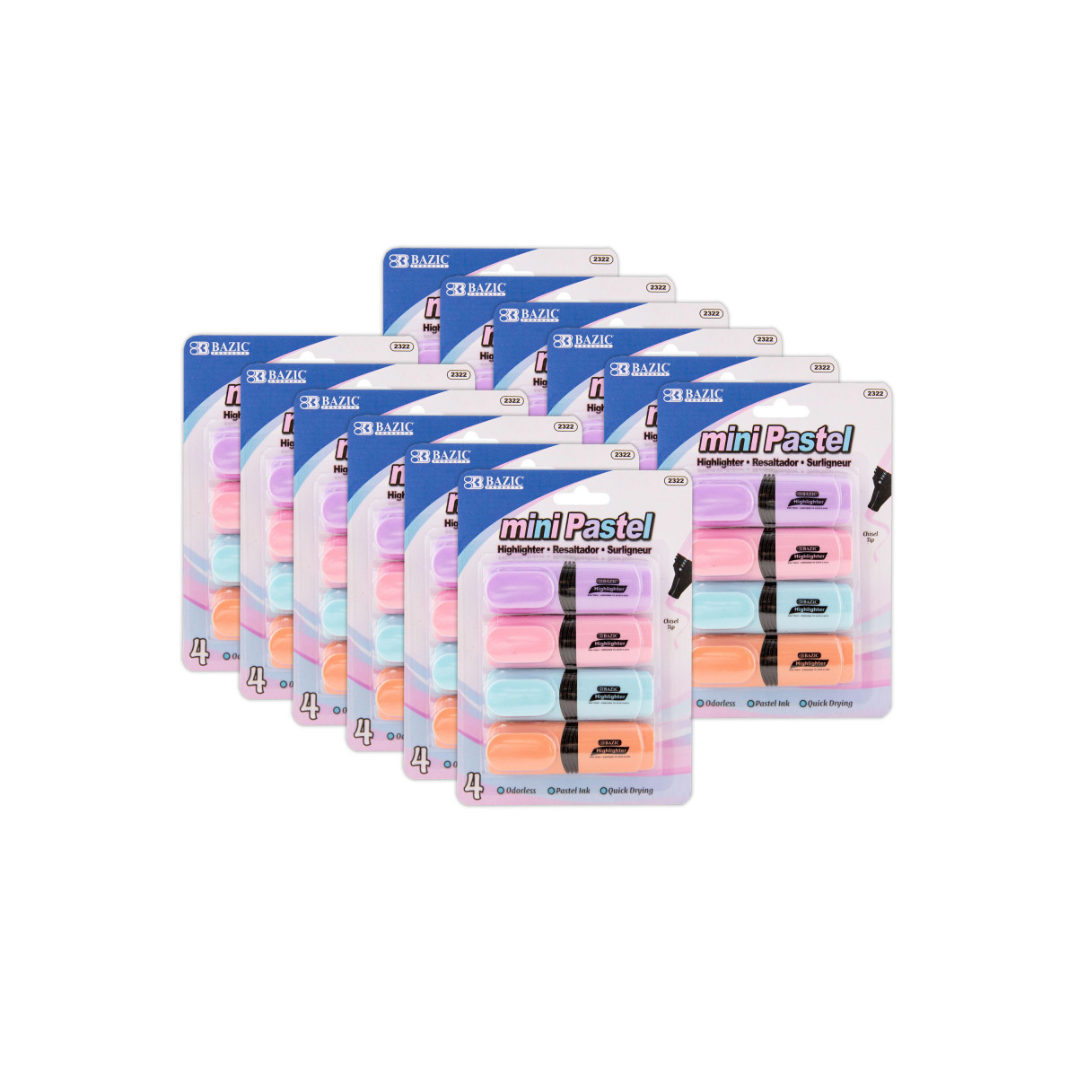 MULTI-PACK. Each pack includes 4 highlighters in pastel colors: Lavender, Pink, Light Blue and Tan. Sold as 12 packs for a total of 48 highlighters.