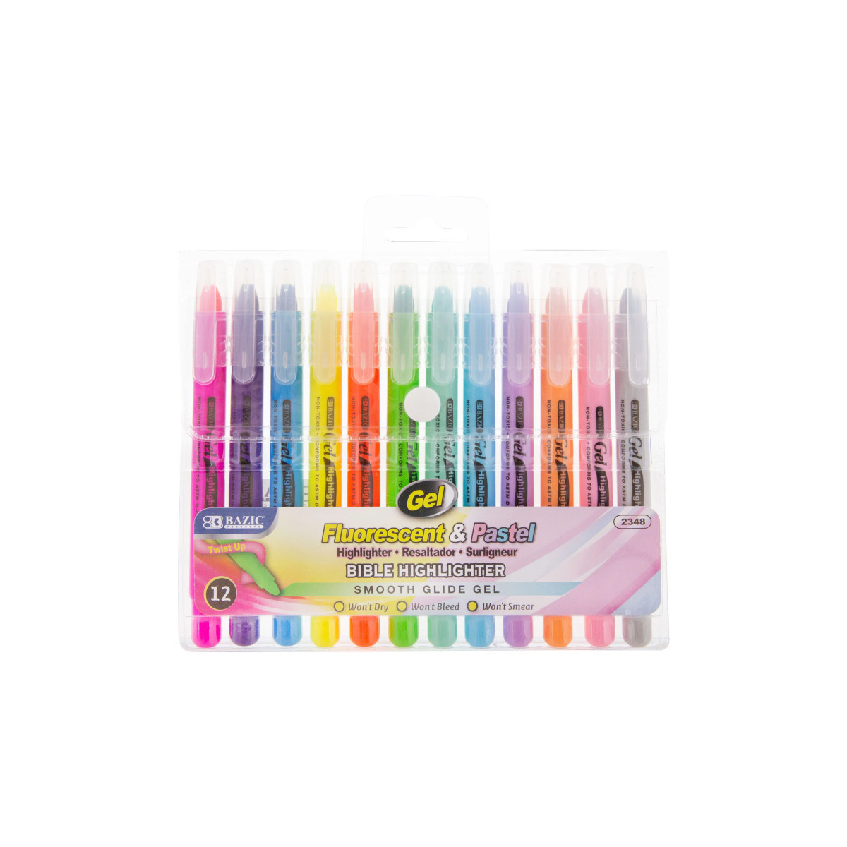 These gel highlighters are also commonly known as bible highlighters, because they are made out of gel not liquid ink. They do not dry, do not bleed through thin paper, nor do they smear. Beautiful vibrant colors, super smooth glides. Assorted colors are perfect for color coding, decoration and highlighting. Twist the end clockwise to extend the gel highlighter, counter clockwise to retract. Each pack includes 12 highlighters in 12 colors.