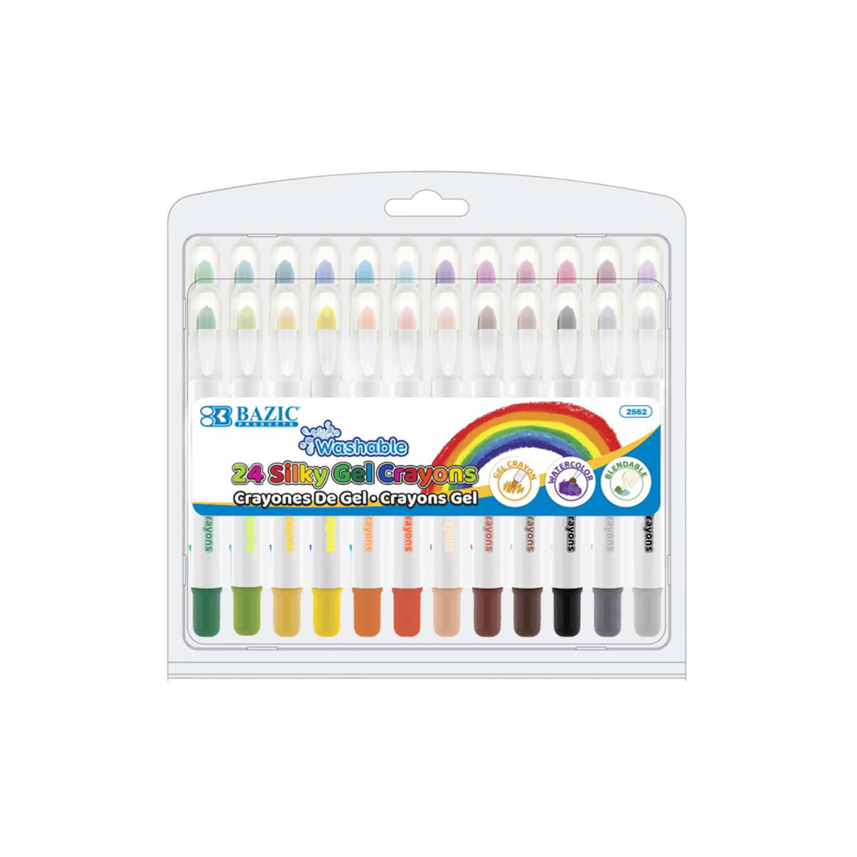 Silky gel crayons feature eye-catching brilliant colors, a buttery texture, and superior blending that helps you create works of art with ease. Little artists can learn the basics of drawing, coloring, and blending because they are ideal for beginners. They're great on textures, dark surfaces, glass, mirrors, paper, and posters. Draw on top of colored pencil, wax crayon, watercolor crayon, and gel pen. Twenty-four washable crayons are stored in a sturdy plastic storage case with individual spots to hold each crayon, so you can always keep them neatly organized and on the go. Non-toxic, acid-free, conforms to ASTM D-4236.