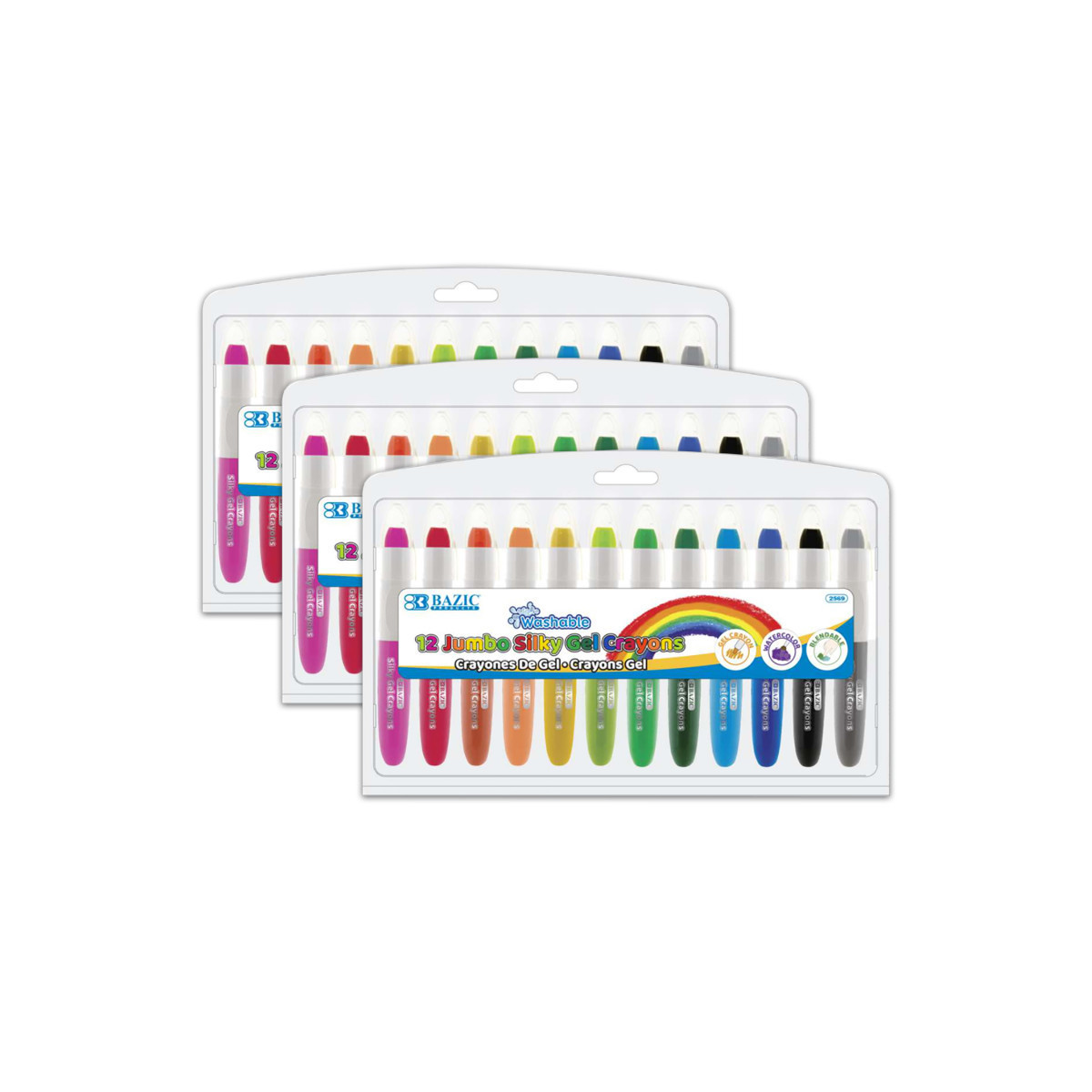 Jumbo silky gel crayons feature eye-catching brilliant colors, a buttery texture, and superior blending that helps you create works of art with ease. Little artists can learn the basics of drawing, coloring, and blending because they are ideal for beginners. They're great on textures, dark surfaces, glass, mirrors, paper, and posters. Draw on top of colored pencil, wax crayon, watercolor crayon, and gel pen. Jumbo washable crayons are stored in a sturdy plastic storage case with individual spots to hold each crayon, so you can always keep them neatly organized and on the go. Non-toxic, acid-free, conforms to ASTM D-4236. Each pack includes 12 crayons. Sold as 3 packs for a total of 36 crayons.