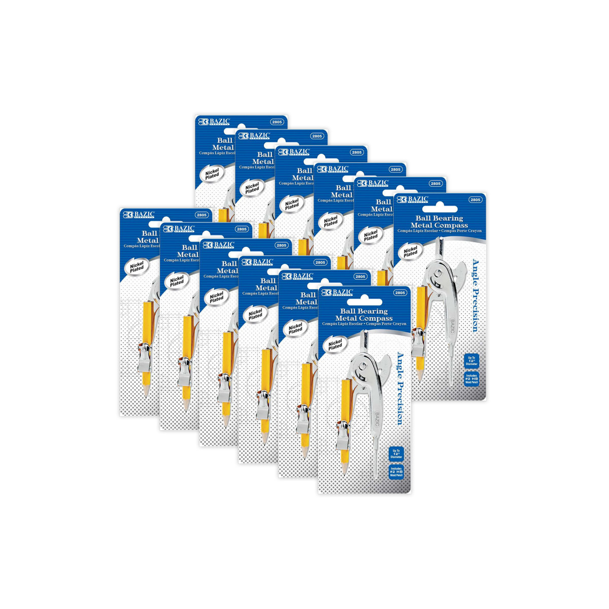 Constructed of steel, this compass withstands bending under pressure to maintain accuracy, ensuring long-lasting use. Its metal construction and exquisite mechanism provide smooth operation. Featuring all-metal construction and nickel plating, this compass boasts a scale-arm and easy-grip top control with a two-sided 6-inch / 15-centimeter measuring capacity. The metal point allows for drawing circles up to 12 inches in diameter. It includes a 3-1/2" #2 HB golf pencil with a secure lock for quick adjustments as needed. This compass is great for drawing arcs, circles, divide gauges, dividing lines, and measuring sizes, making it perfect for precise drawings. Use it to trace and draw perfect angles, circumferences, graphs, and designs with ease. It is excellent for use in school, office, studio, or at home, serving as the best circle-drawing tool for students, artists, mathematicians, carpenters, engineers, architects, and designers. Sold as a pack of 12 compasses, each with golf pencil.