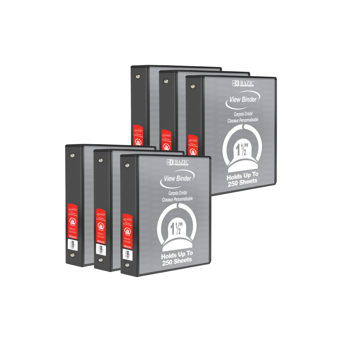 This 1.5 inch hard cover binder features a clear view on the front, back and side so you can customize! Each binder can be easily identified when a piece of paper with artwork or title is inserted from the opening on the top. This binder has 3 metal rings that are "O" shape, attached inside on the spine of the binder. Sold as a pack of 6 binders.