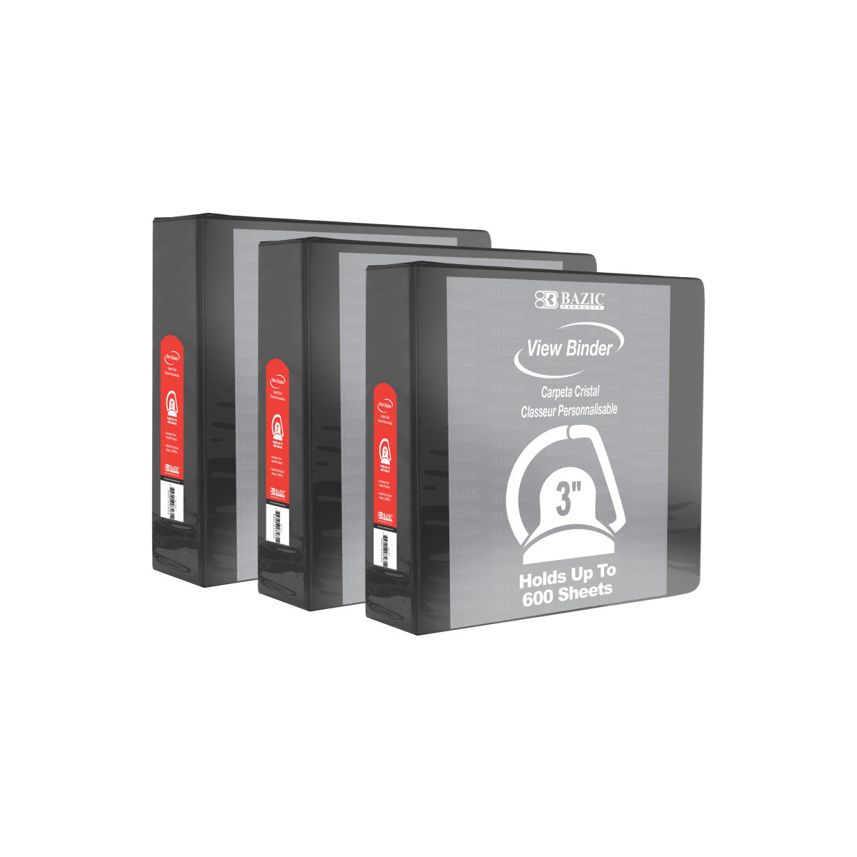 This 3 inch hard cover binder features a clear view on the front, back and side so you can customize! Each binder can be easily identified when a piece of paper with artwork or title is inserted from the opening on the top. This binder has 3 metal rings that are "D" shape, attached inside on the back of the binder, so that you can fit more documents. Sold as a pack of 3 binders.