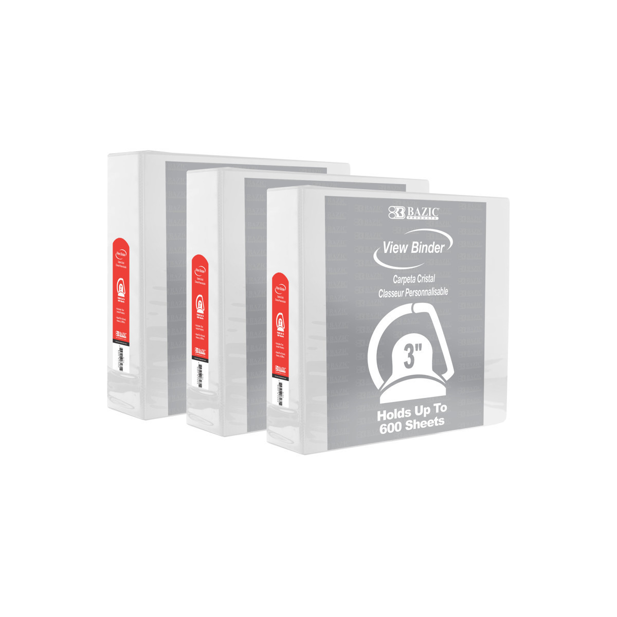 This 3 inch hard cover binder features a clear view on the front, back and side so you can customize! Each binder can be easily identified when a piece of paper with artwork or title is inserted from the opening on the top. This binder has 3 metal rings that are "D" shape, attached inside on the back of the binder, so that you can fit more documents. Sold as a pack of 3 binders.