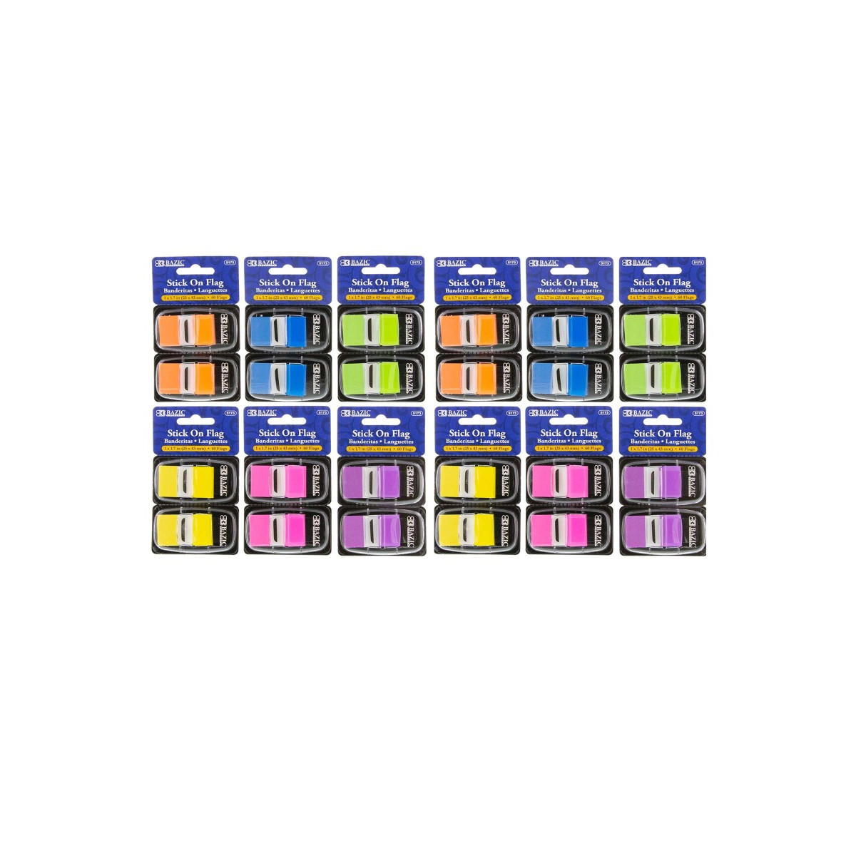 Self-stick flags adheres securely and allows repositioning with ease. Durable material prevents wear and tear from repeated handling and use. Features durable perforated cardboard dispensers with plastic cover. Sold in assorted colors (no color choice): Neon Orange, Neon Blue, Neon Green, Neon Yellow, Neon Pink OR Neon Purple. Measures 1" x 1.7". Each dispenser includes 30 flags. Each pack includes 2 dispensers for a total of 60 flags. Sold as 12 packs for a total of 720 flags.