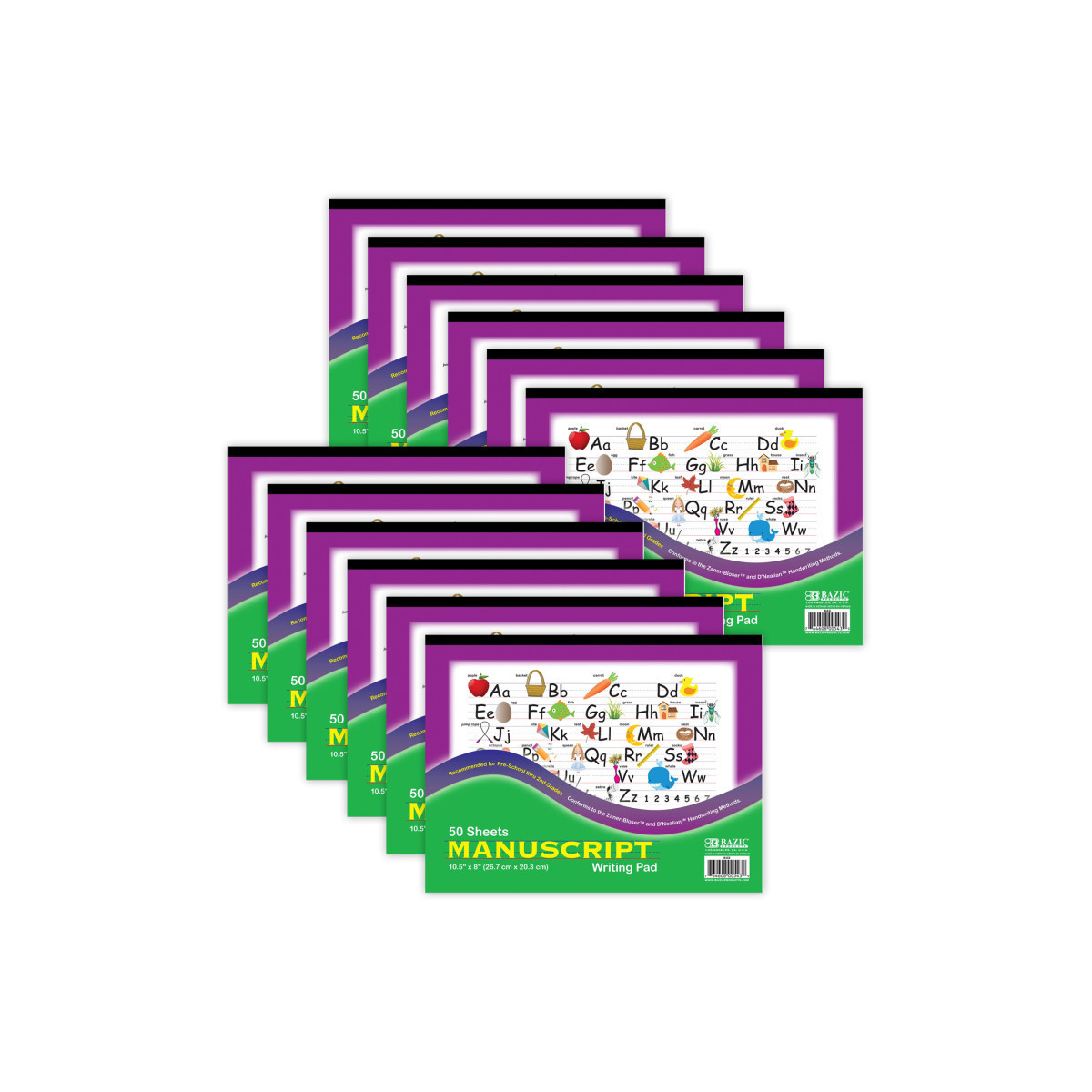 Manuscript Writing Pad includes 50 sheets measuring 10.5" x 8". Primary ruled (9 lines per page) to teach children how to properly position block letter printing, manuscript, and cursive writing. Features 1/2-inch ruling, 1/4-inch midline, and 1/4-inch skip space. Recommended for preschool, first grade, and second grade children. Block templates help refine fine motor skills in kids and are beneficial for stroke patients relearning fine motor control. Practice the alphabet with double-sided writing pads. Clear line rulings help maintain capital letters and lowercase positions, creating a guide for writing straight sentences. An amazing notepad for birthdays, holidays, celebrations, school events, and projects. This is a great creative writing and learning supply approved by teachers and parents, keeping young children focused on the task of writing without too many other graphics or distractions on a page. It helps writers be consistent in letter size, spacing, and straight lines. Sold as a pack of 12.