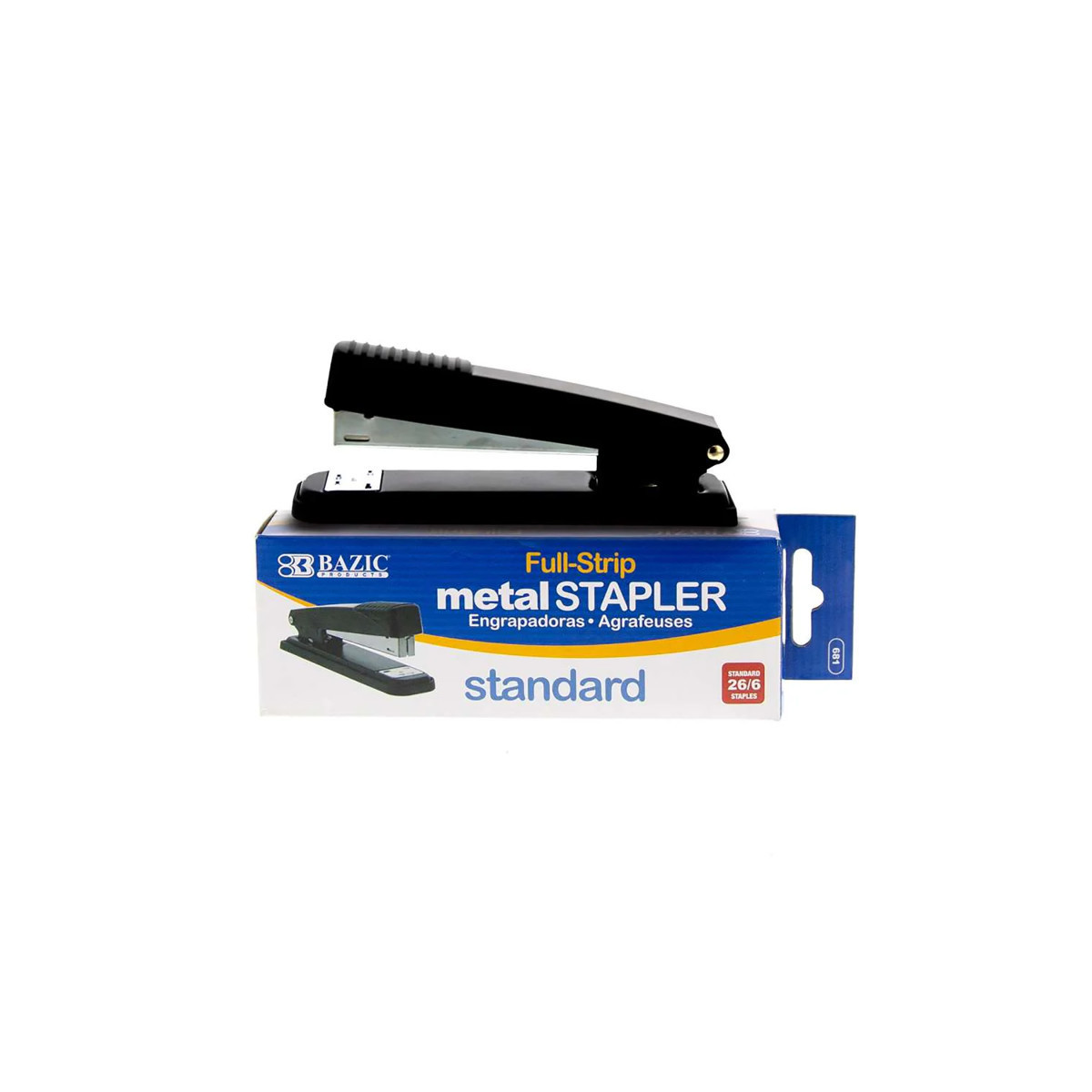 - FULL STRIP DESKTOP SIZE. Staplers measure 6.25" x 2.25" x 1.5". All-metal black stapler is designed for durability.