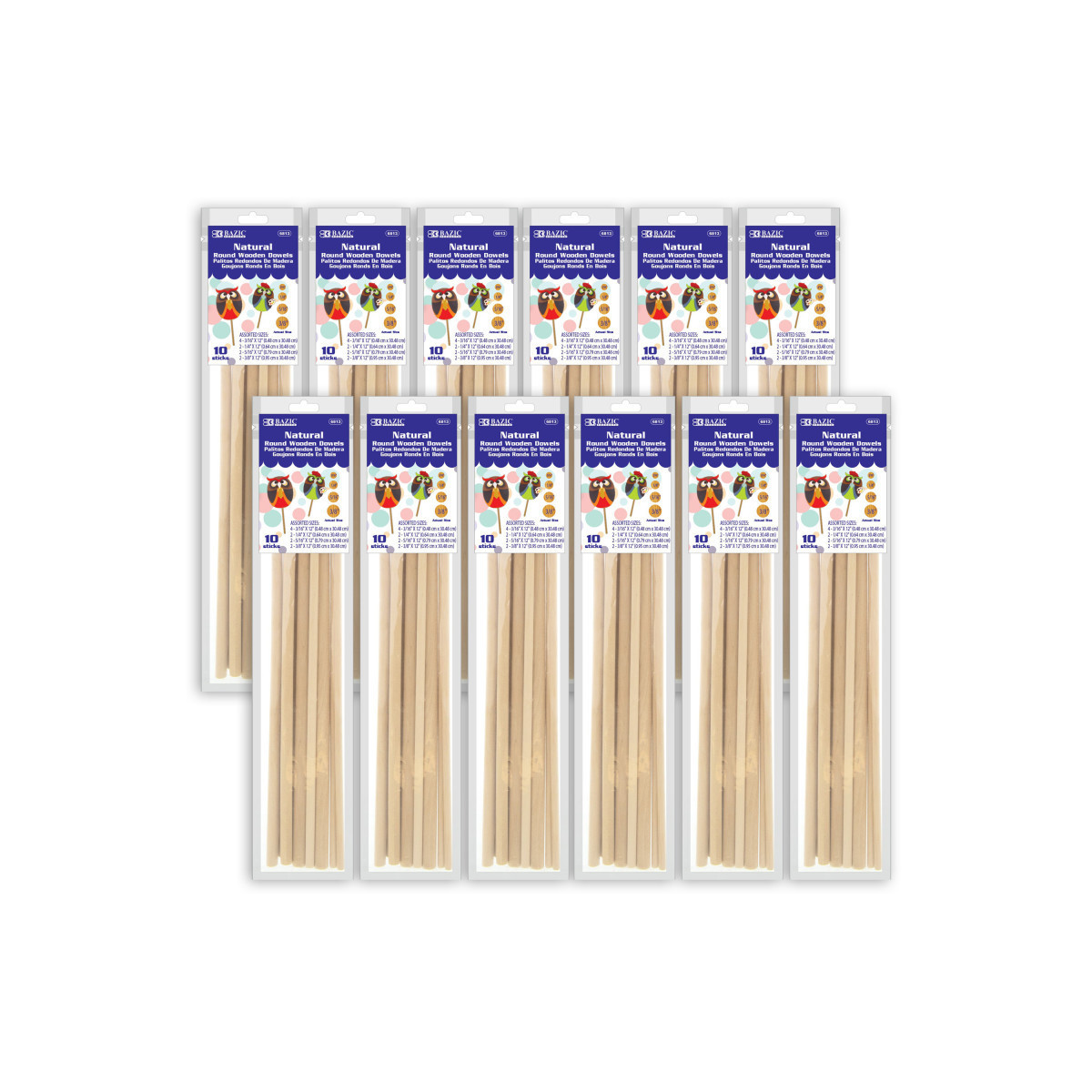 These assorted diameter, 12" long round wooden dowels are made from white Baltic birch, and come pre-sanded and smooth. Safe, clean, unblemished wood craft sticks are great for DIY projects. Ideal for wedding cake layer support, and sharpens easily with pencil sharpener for insertion. Must have tools for homemade desserts like candy, lollipops, cake pops, birthday cakes. These high-quality wooden dowel rods are perfect for dollhouses, making wood toys, detailed wood crafts, model building, kids crafts, home decor, and much more. Each hardwood dowel rod is completely sanded and smoothed down during production so the hard work is already done for you. They are safe for kids and school use. Great teacher supplies in the classroom for a puppet show, flags, wedding props, photo props, kids crafts, handmade gifts. Each pack includes 10 dowels: 4 pieces of 3/16" x 12", 2 pieces of 1/4" x 12", 2 pieces of 5/16" x 12", and 2 pieces of 3/8" x 12". Sold as 12 packs for a total of 120 dowels.