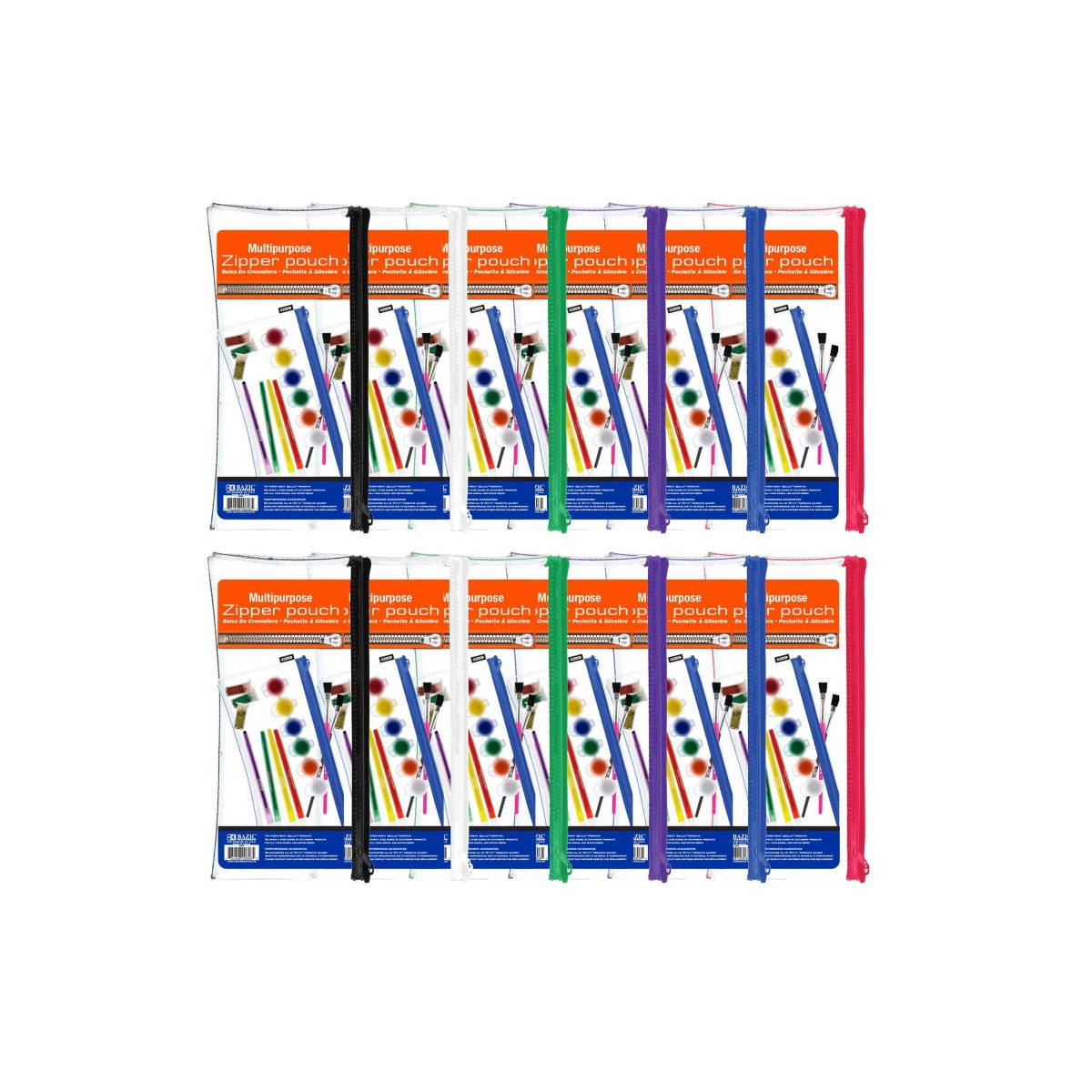 Clear Pencil Pouch is a large, clear pocket to hold pens, pencils and accessories. Durable plastic material is made to last. Clear vinyl binder pouch fits standard ring binders. Clear plastic allows easy viewing of contents. Measures 11" x 5". Sold as a pack of 12 pouches with assorted color zippers (no color choice).