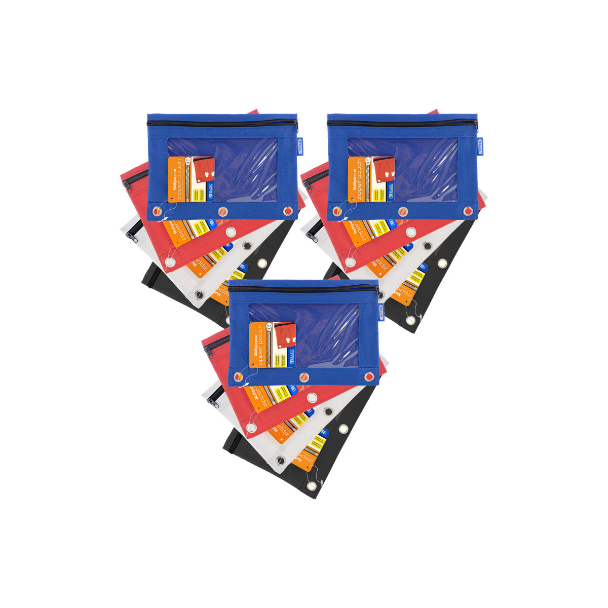 Measures 9.8" x 7". Made of durable 600D polyester - scratch resist. Features reinforced 3 ring holed on bags to place in binders. Safe and non-toxic. Features a quality zipper closure for easy access, and to secure your items. One compartment with clear window allows to see through and find things easily. Ideal for organizing small items like pens, pencils, crayons, markers, whiteout, highlighter, business card, checks, receipt, flash cards, charging cords, USB cables and more. Great gift for young kids for organizing. Keep everything in their own bag so they won't miss anything. Fun, colorful, and elegant. Perfect for teachers, students, adults, teens, and children. Sold as a pack of 12 pouches in 4 colors: Blue, Red, Black, White (no color choice).