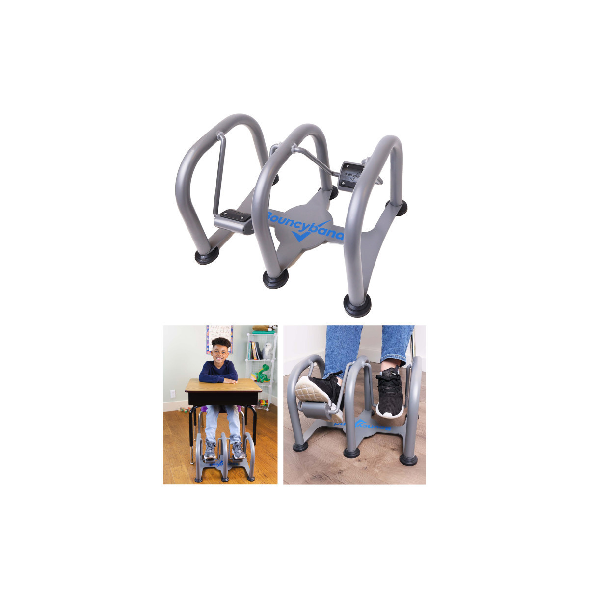 Bouncyband foot swing silently enables the release of excess energy while sitting alleviating anxiety and increasing concentration. Focus more and fidget less! Fidgeters place feet on separate pedals independently moving them back and forth relieving stress and decreasing boredom. Quiets the urge to move by releasing excess energy improving seat behavior enabling greater concentration. Excellent for school and home fitting under desks and tables leaving the hands free for class and homework. Made of heavy gauge steel and thick rubber feet, stays in place on both hard floors and carpets. Therapeutic footrest provides relief and is beneficial for everyone including those with ADHD, autism, and sensory processing disorder. Measures 17.5" x 14" x 12".