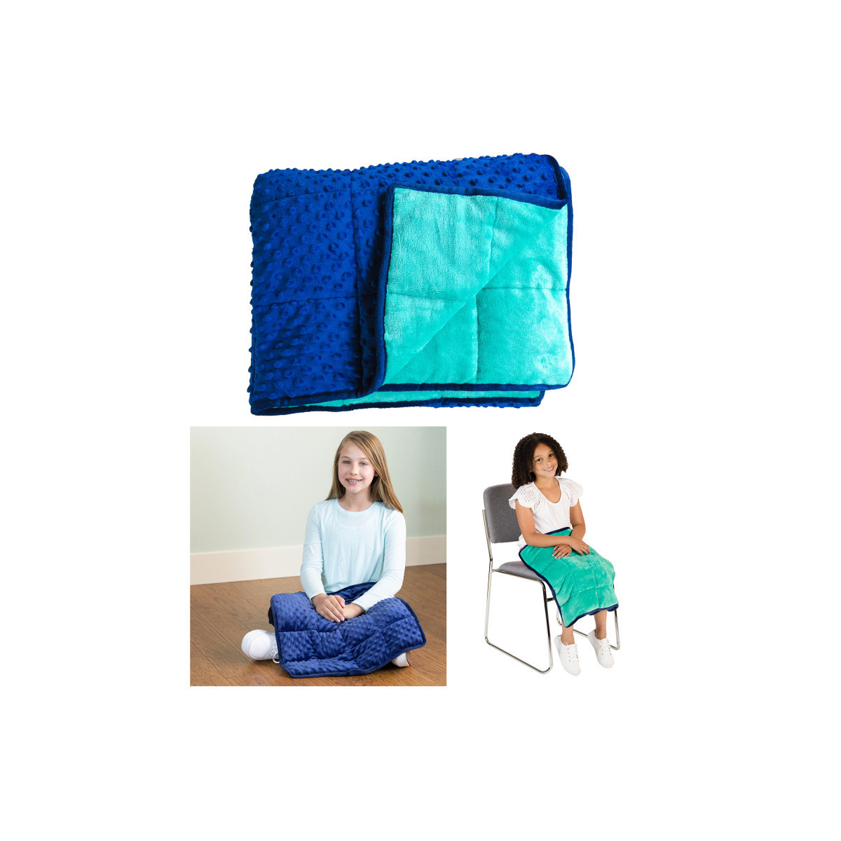 The gentle deep touch pressure of the weighted blanket makes kids feel more secure and helps to relieve stress and anxiety, enabling them to relax during the day and sleep better at night. Excellent for stressful situations in the classroom and at home. Reversible 2 color blanket with soft nubs on one side and silky smooth plush on the other combine with even weight distribution to help children concentrate. Weighted blanket feels like a warm soothing hug providing a sense of well-being. Kids who are more comfortable inside are more confident outside. Naturally calms and cocoons children allowing them to relax encouraging a more consistent and restful sleep. Can be rested across the shoulders and back, on lap or stomach when reading, studying, or relaxing.