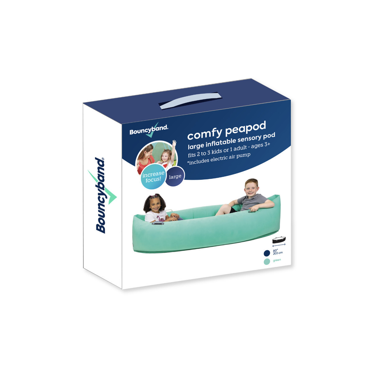 Comfy Hugging Peapod's soothing deep pressure offers a caressing hug, enabling a calming sense of security. Just a few minutes in the Comfy Peapod relaxes, quiets and calms down most users. Perfect for those who are fidgety and can't sit still to read, study, or just relax. Includes electric air pump.