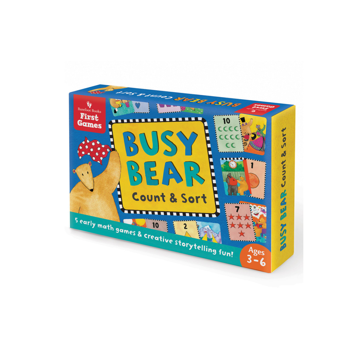 Get ready to play and learn with Bear! For 20 years, Bear has delighted children as Barefoot Books' most beloved character — and now, children can practice early math, storytelling and taking turns with Bear as their guide! Created by an early childhood expert as part of the new Barefoot Books First Games series. These 30 double-sided cards and instructions for 5 games encourage early math and creative play activities like counting from 1 to 10, finding all the shapes, taking turns, and telling a story about Bear's day.