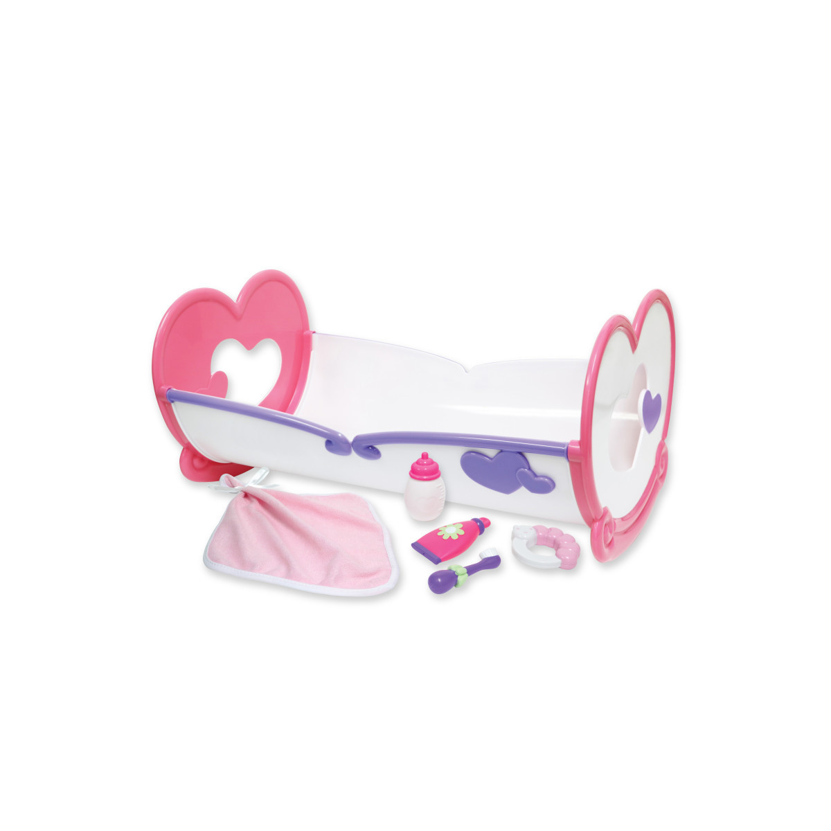 Sturdy doll cradle featuring unique heart shaped design. Pretend play with dolls encourages holding, nurturing, and special care for developing social skills in children ages 2 and older. Additional doll accessories included to encourage pretend play with baby doll.